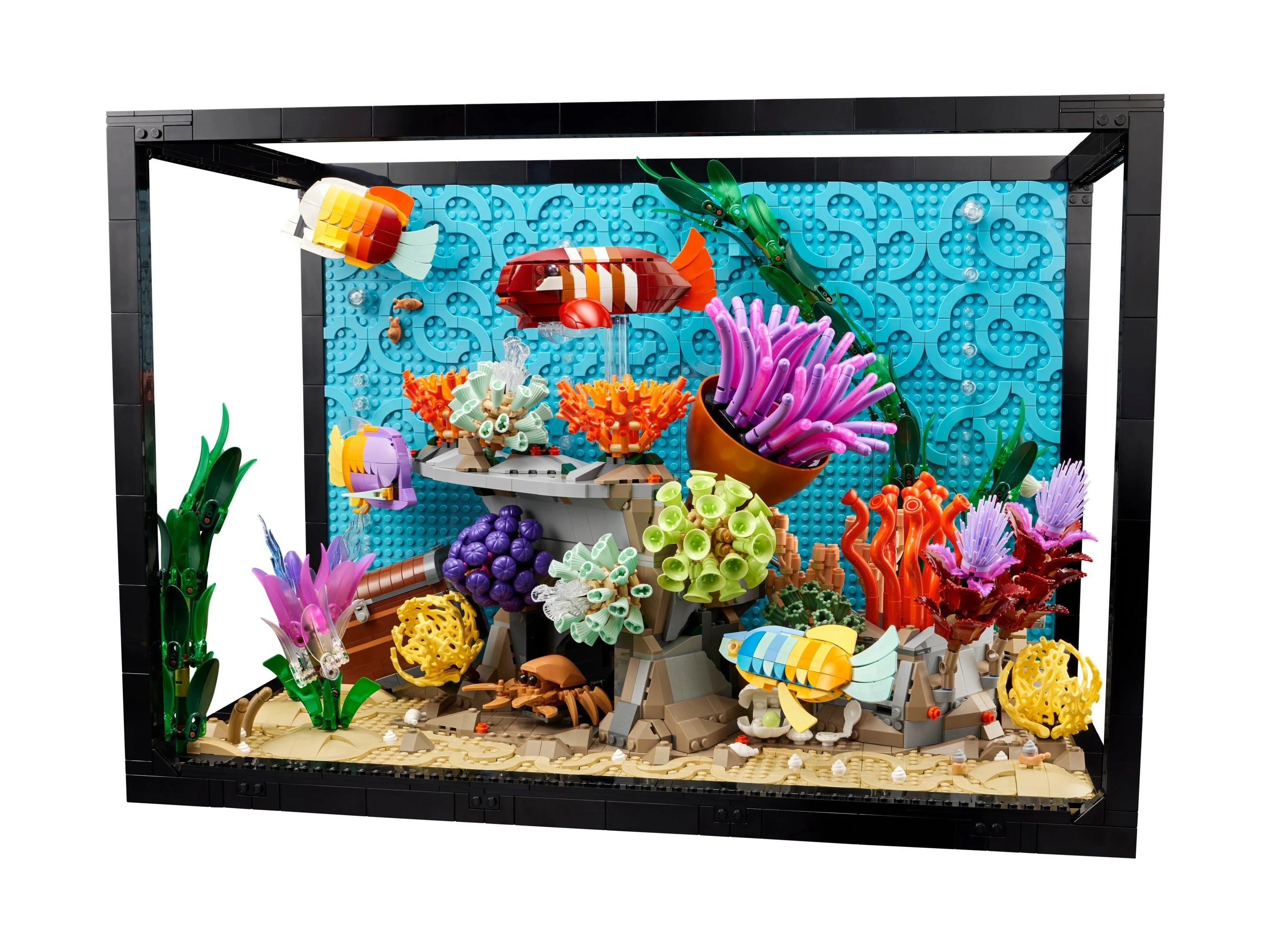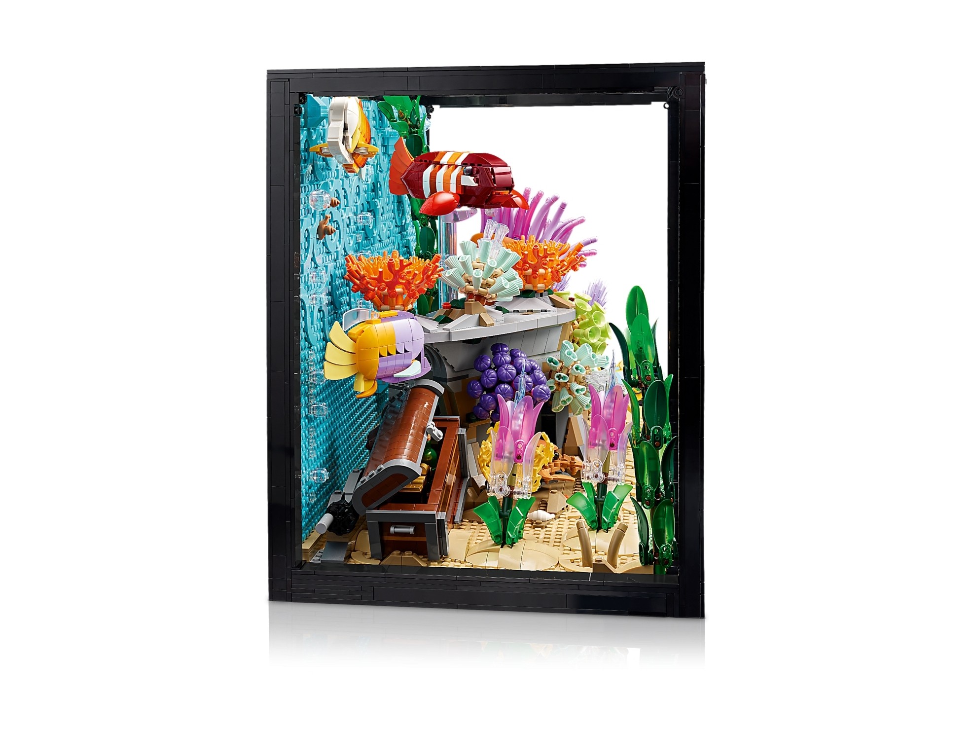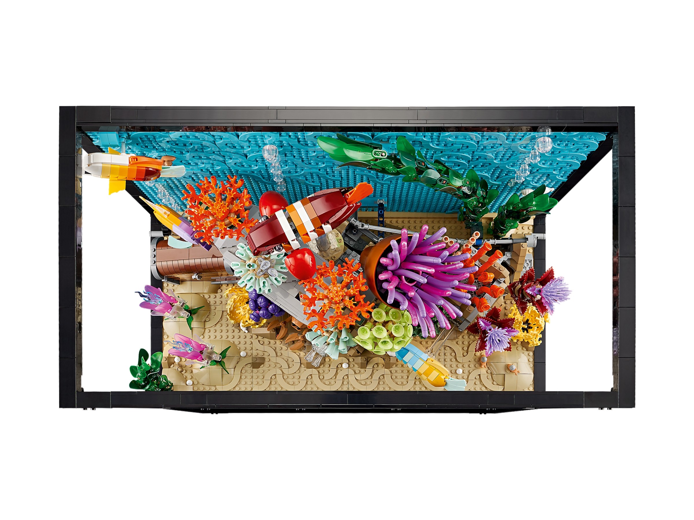 To ozdobne akwarium ma także ciekawe funkcje. Obracaj pokrętłami i korbkami, aby poruszać pływającą rybą, kołyszącym się koralowcem, krabem wyłaniającym się z podwodnej jaskini i otwierającą się skrzynią ze skarbami. Akwarium zawiera cztery modele ryb oraz rozmaite rośliny i koralowce, owady morskie, ostrygę z perłą, a także ślimaki morskie LEGO i bąbelki.