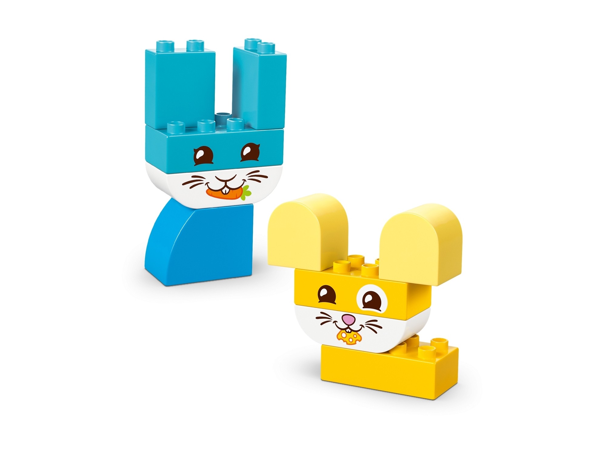 Idź do instrukcjiWypełnij czas zabawy kolorami i kreatywnością dzięki zabawce Mój pierwszy zestaw LEGO® DUPLO® Kreatywne zwierzaki 3 w 1 (10477). Ta urocza zabawka dla dziewczynek i chłopców w wieku od 18 miesięcy oferuje trzy różne opcje budowania przy użyciu tego samego zestawu klocków.Korzystając z 24 łatwych w obsłudze klocków zaprojektowanych specjalnie dla najmłodszych dzieci, mali konstruktorzy mogą wybierać spośród figurek psa, kota, ptaka, królika, myszy i ryby do zbudowania. Niektóre z tych zabawek wykorzystują jednokolorowe klocki LEGO DUPLO. Mali konstruktorzy mogą nauczyć się sortować elementy według kolorów, aby stworzyć swojego zwierzaka, a następnie skończyć figurkę, dodając uroczą twarz zwierzęcia.Ten niewielki prezent, pełen zajęć edukacyjnych dla maluchów, zachęca je do rozwijania koncentracji i wytrwałości podczas próbowania różnych klocków, aby wybrać te właściwe i ułożyć zwierzę. Mogą także wykorzystać swoją kreatywność, aby stworzyć własne, wymyślone stworzenie! Zestaw składa się z 24 elementów.