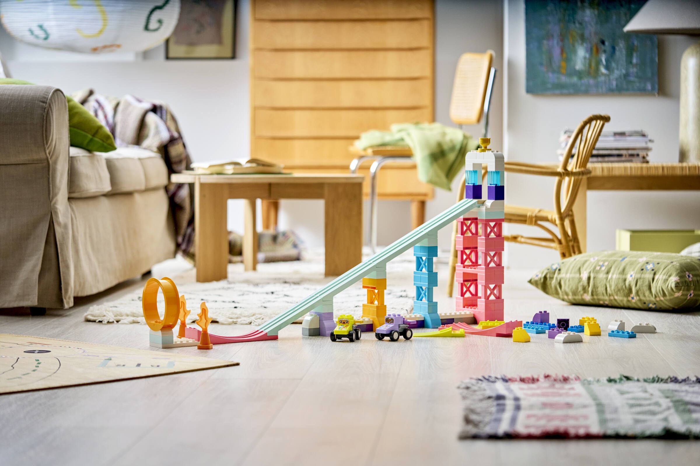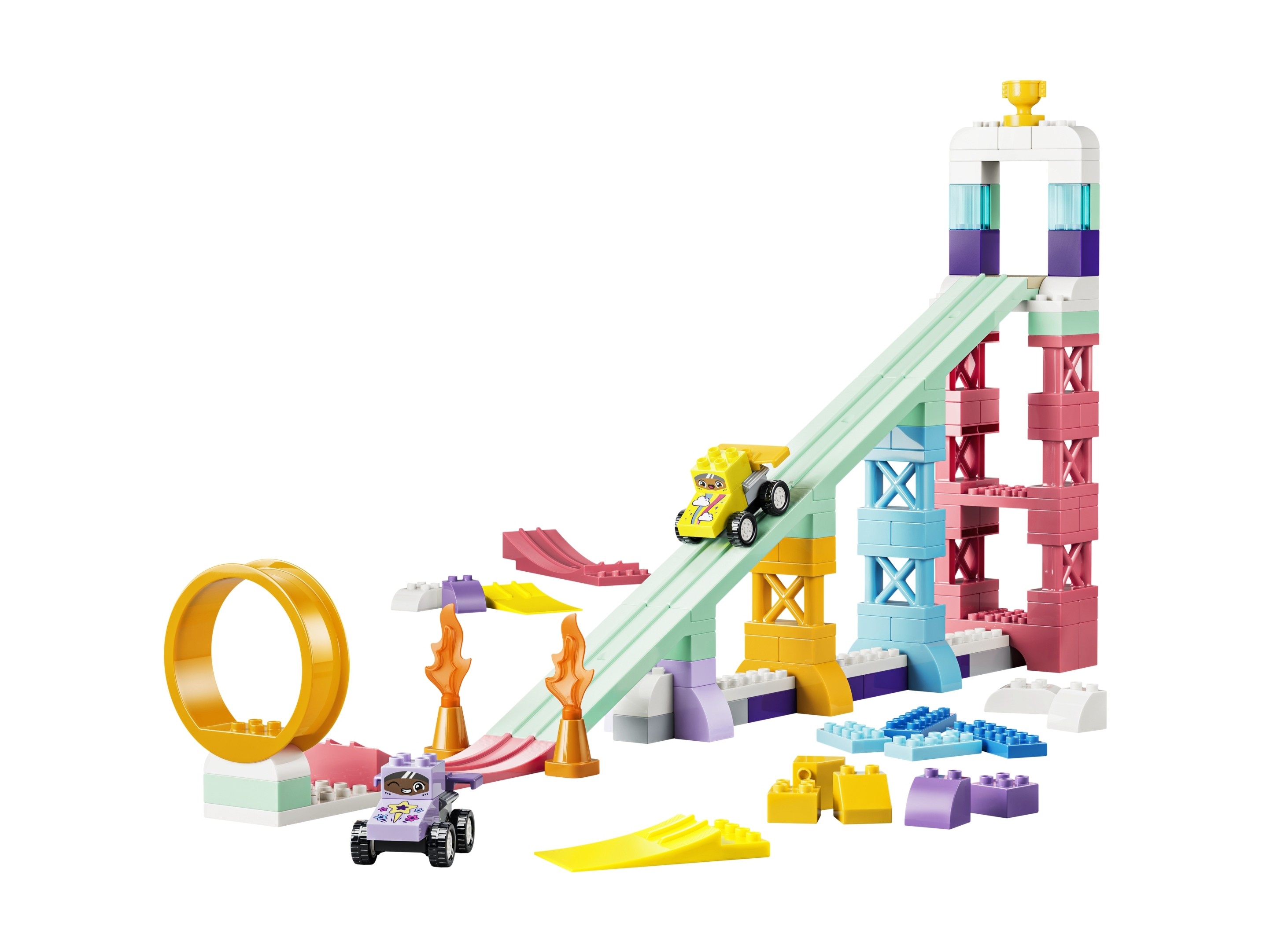 Model LEGO® Kreatywne rampy 3 w 1 z pojazdami jest częścią serii LEGO® Duplo®, która słynie z edukacyjnych wartości i realnych scenariuszy. Do zestawu dołączone są akcesoria takie jak płomienie, pachołki czy puchar, które dodają realizmu każdemu wyścigowi. To doskonała okazja, aby dzieci mogły zrozumieć otaczający je świat poprzez zabawę, która jednocześnie uczy i bawi.