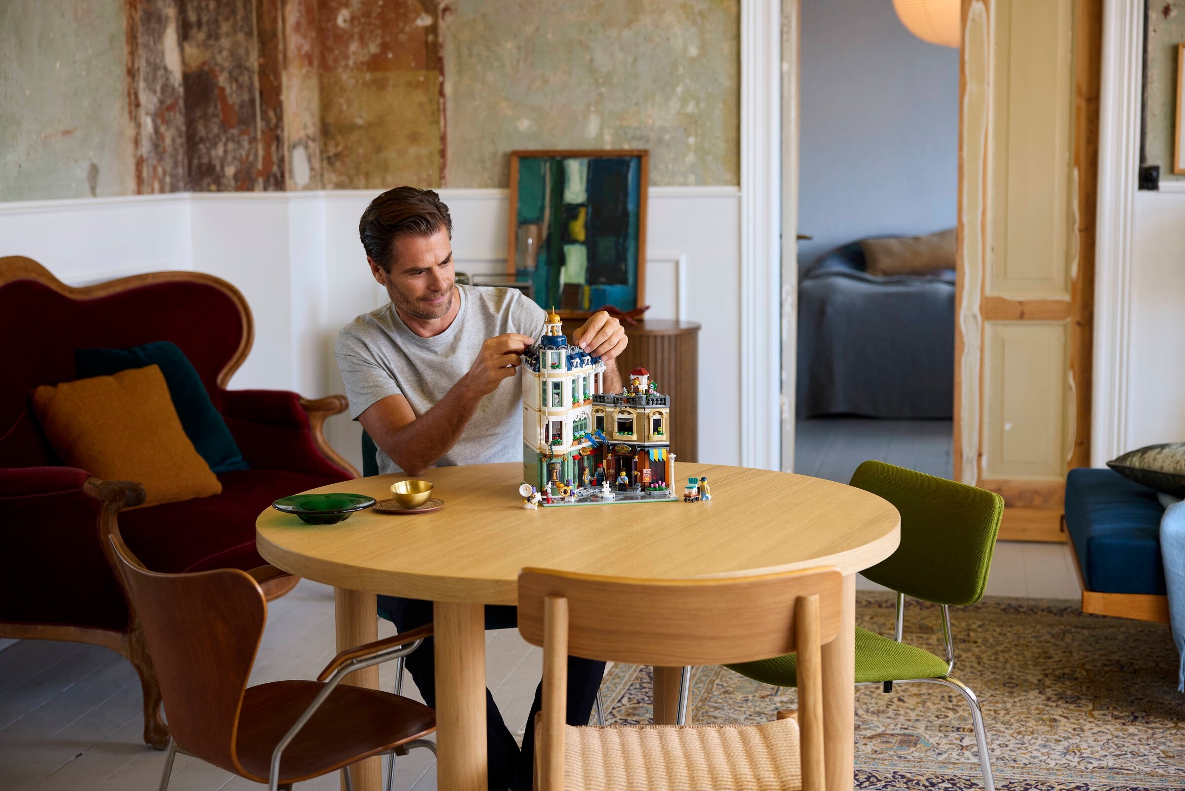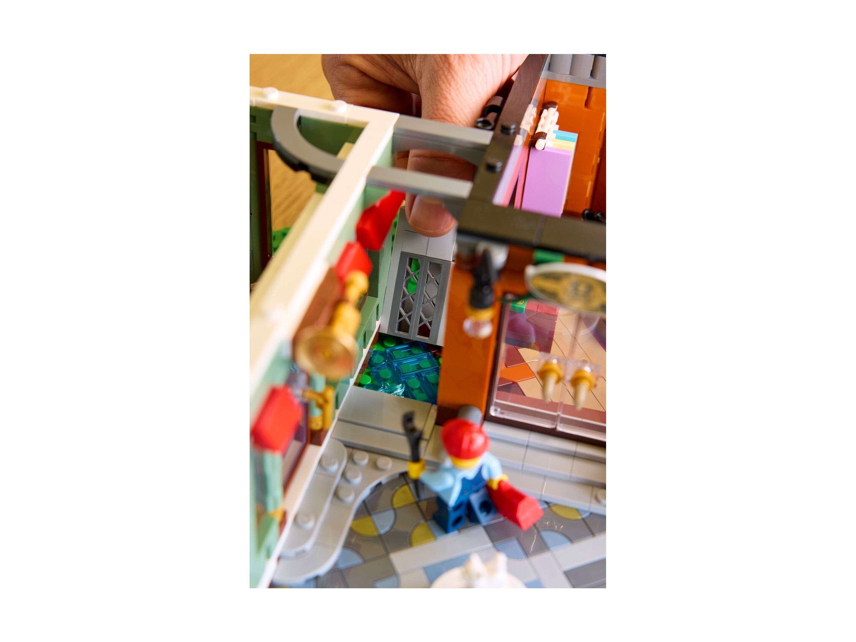 Trzypiętrowy budynek obejmuje dwupiętrowy sklep muzyczny z instrumentami dla orkiestr dętych oraz przylegający do niego sklep meblowy wyposażony w ladę, stołki, stół i warsztat. Na najwyższym piętrze znajduje się umeblowane mieszkanie z łazienką, a w ogrodzie na dachu jest miejsce na rośliny doniczkowe i gołębnik. Ten model idealnie nadaje się jako ozdoba domowego biura. Zawiera siedem minifigurek i ma modułową konstrukcję, która zapewnia łatwy dostęp do wnętrza.