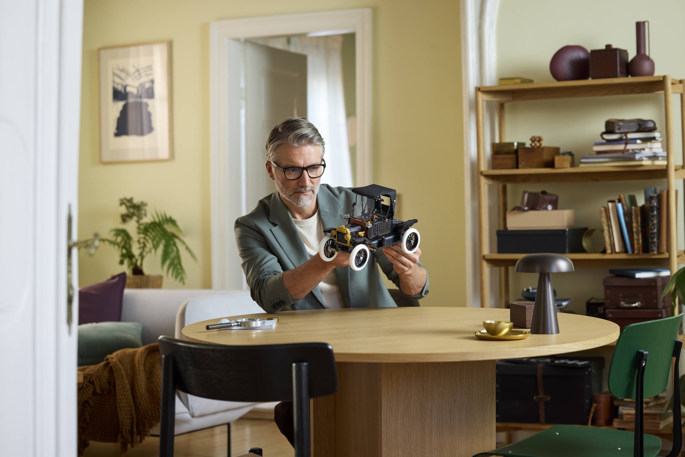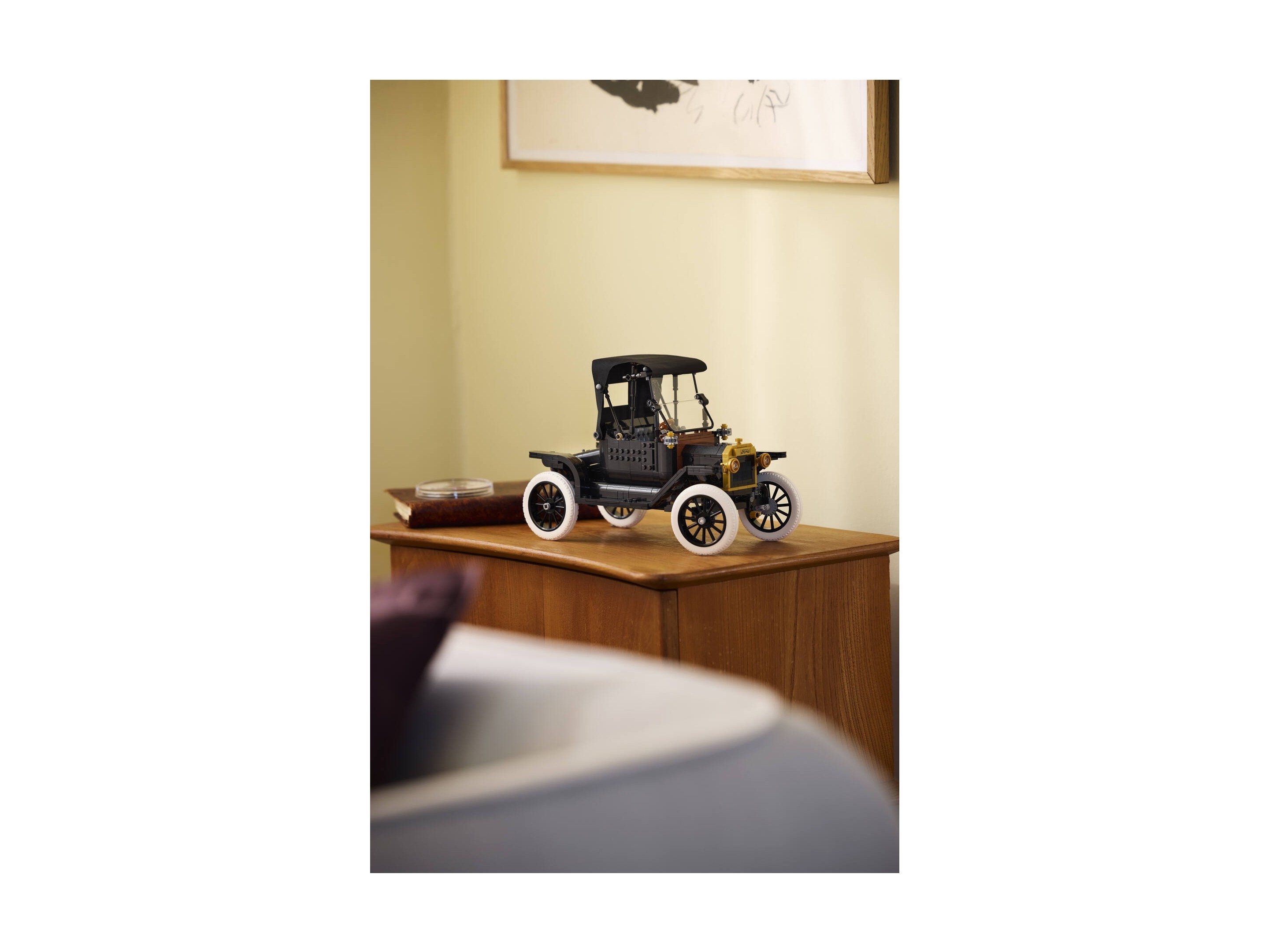 Zobacz takżeUczcij ikonę motoryzacji dzięki zestawowi LEGO® Icons Ford Model T (11376) dla dorosłych. Ta autentyczna replika samochodu z początku XX wieku ma składany dach z tkaniny, składaną przednią szybę i pojedyncze otwierane drzwi pasażera. Inne cechy obejmują otwierany tylny bagażnik oraz bardzo szczegółową kabinę kierowcy z działającym układem kierowniczym. Podnieś siedzenie, aby uzyskać dostęp do zbiornika paliwa. Podnieś panele maski z obu stron i odsłoń silnik, a następnie obróć korbą, aby uruchomić wentylator. Ozdobiony czarną karoserią, złotymi akcentami i wysokimi felgami szprychowymi z wąskimi białymi oponami model samochodu w stylu vintage stanowi elegancką ozdobę domu lub biura.Ten model premium to świetny pomysł na prezent dla miłośników klasycznych amerykańskich samochodów. Sprawdź inspirującą serię zestawów LEGO (sprzedawanych osobno) stworzonych specjalnie dla dorosłych.Buduj sprytniej dzięki aplikacji LEGO Builder — powiększaj, obracaj model w 3D, śledź swoje postępy i korzystaj z cyfrowych, szczegółowych instrukcji. Zestaw składa się z 1060 elementów.