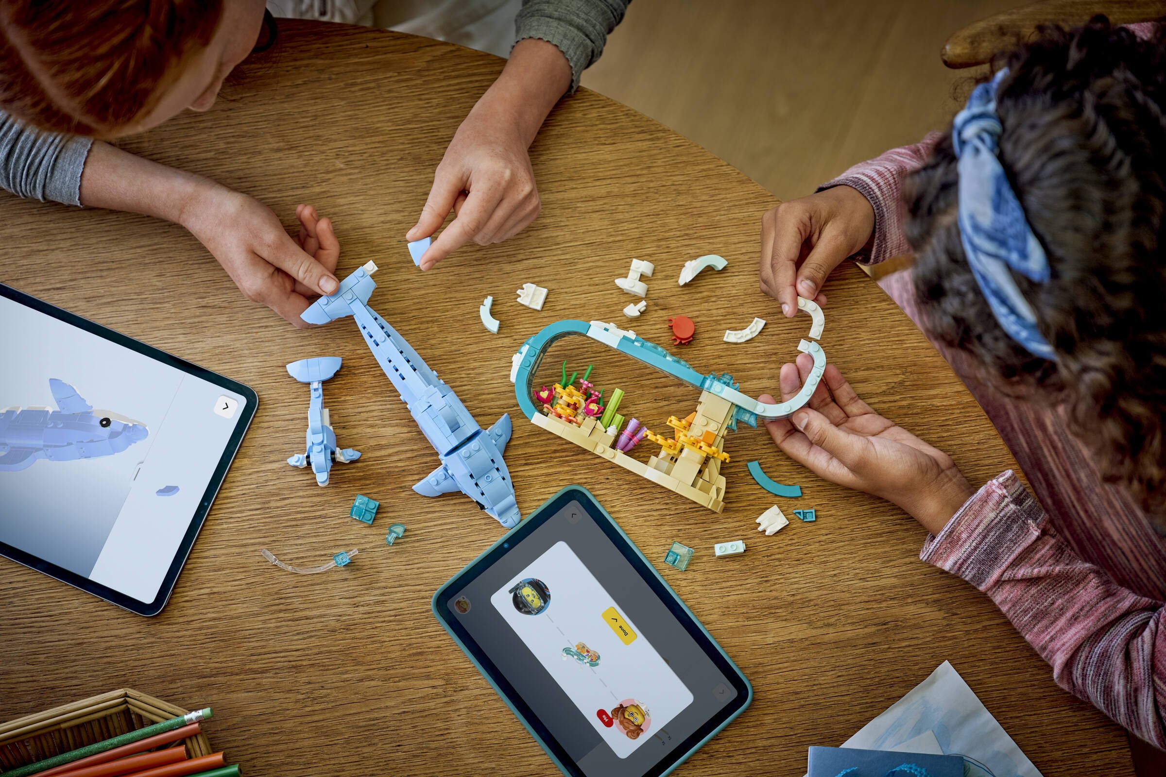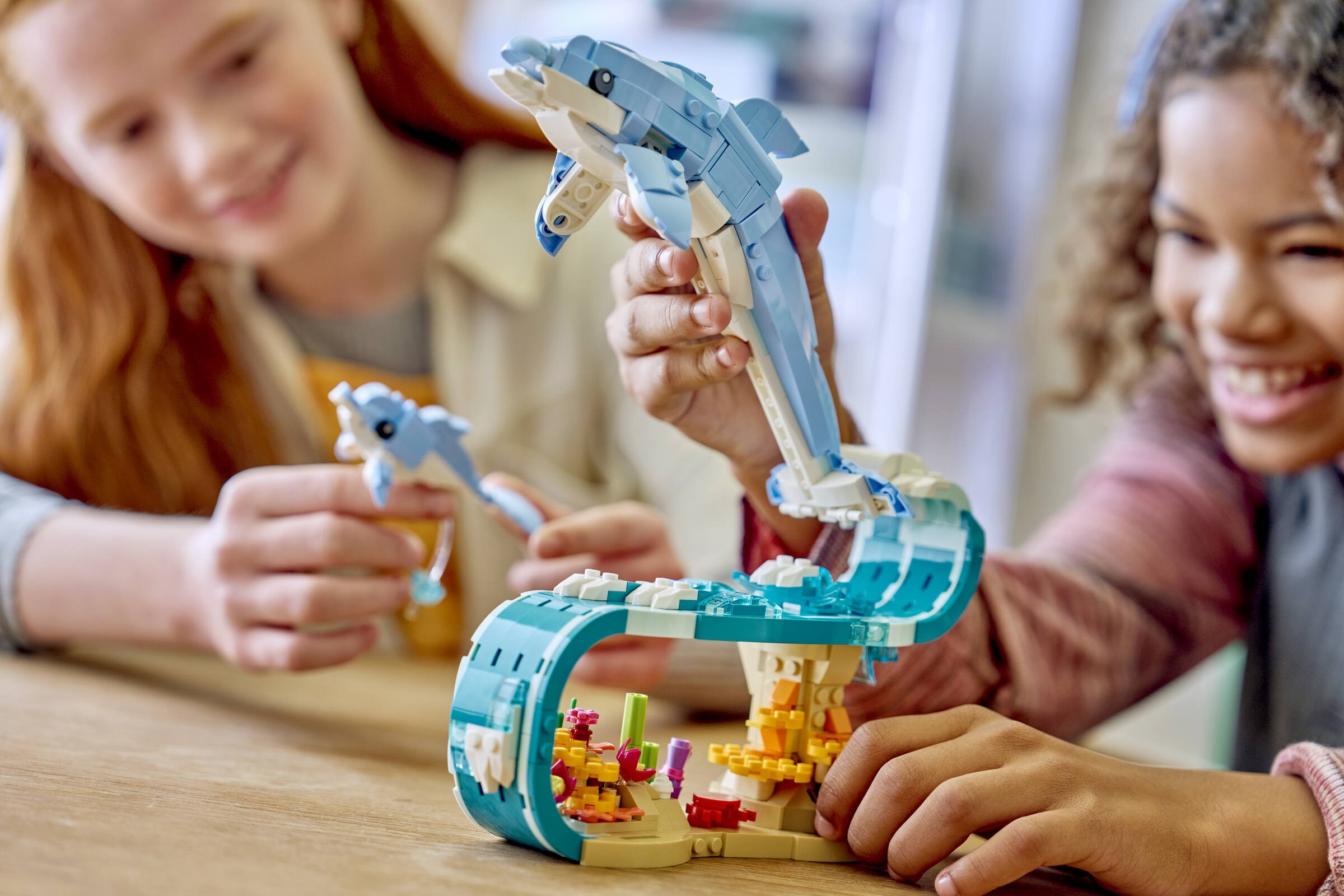 Zestaw LEGO® Zwierzęta morskie: piękny delfin pozwala na zbudowanie dynamicznego modelu dorosłego delfina i jego młodego, które pływają nad rafą koralową. Można go również przebudować w pełnego wdzięku konika morskiego na kolorowej podstawce z wodorostami lub w kraba z roślinami morskimi i meduzą. Każda z tych figur to nie tylko zabawa, ale także wyjątkowa dekoracja do pokoju dziecięcego.