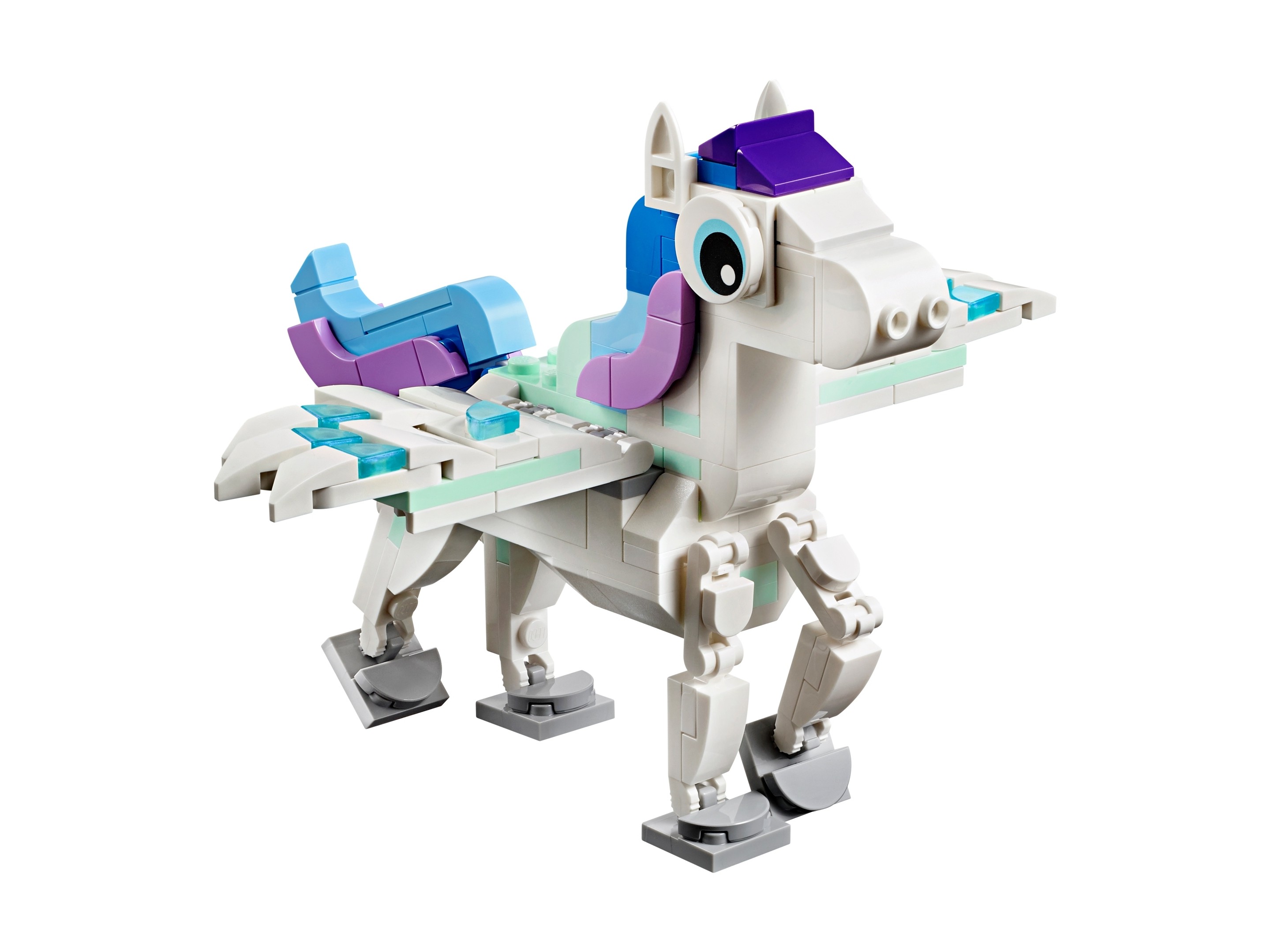 Dzięki zabawce 3 w 1 Mityczny pegaz (40691) kreatywne dzieci w wieku od siedmiu lat przeniosą się do magicznego świata, aby odgrywać fajne historie. Uroczy skrzydlaty koń ma ruchome kopyta, skrzydła, głowę i ogon. Można go ustawić na czterech nogach — lub tylko na tylnych, umieszczając go na podstawie. Następnie dzieci mogą przebudować go na mitycznego smoka z ruchomymi skrzydłami i ogonem lub mitycznego ptaka z rozpostartymi skrzydłami gotowymi do lotu. Każdy model można ustawić na majestatycznym postumencie w greckim stylu.