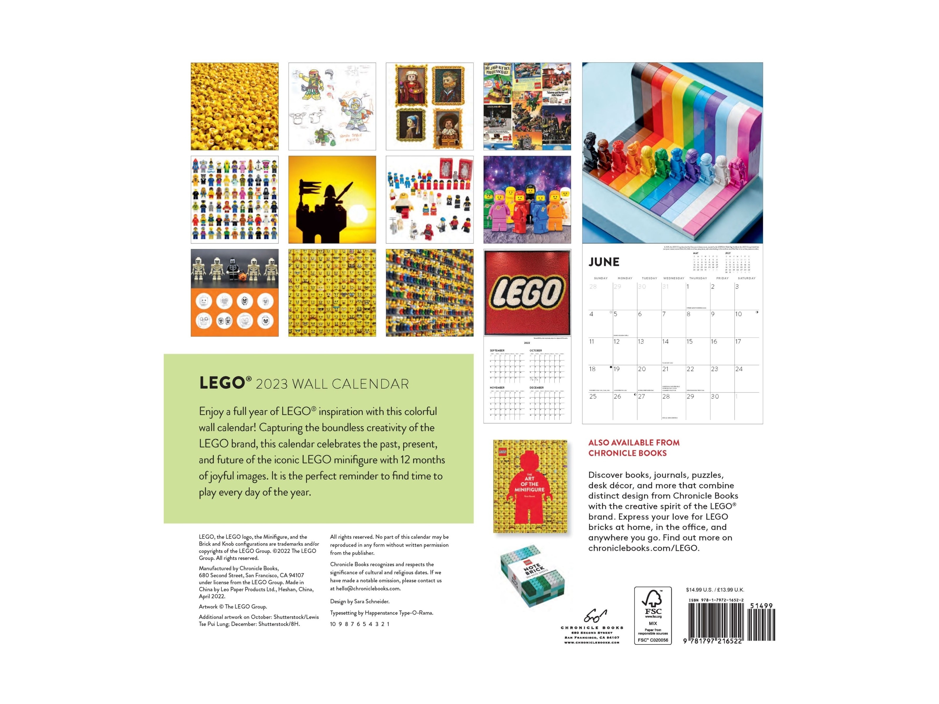 Kalendarz ścienny LEGO® na 2023 rok zapewni comiesięczną dawkę inspiracji LEGO przez cały rok. Każdy miesiąc to ukłon w stronę klocków i minifigurek LEGO oraz wspaniałych prac i odważnych projektów z dawnych i obecnych czasów. Kalendarz można z łatwością powiesić w domu lub w biurze. Możesz też cieszyć się nim, zanim rozpocznie się 2023 rok, ponieważ zawiera także przegląd miesięcy od września do grudnia 2022 roku.
