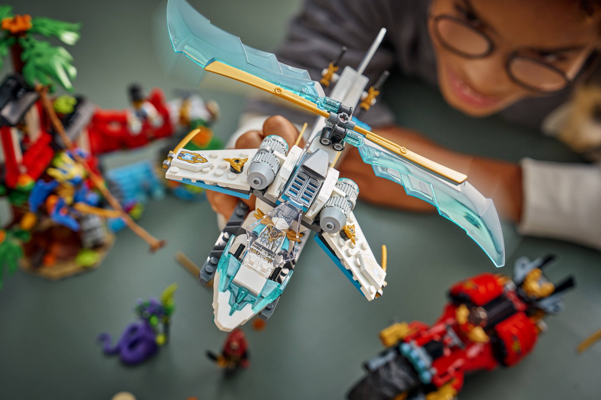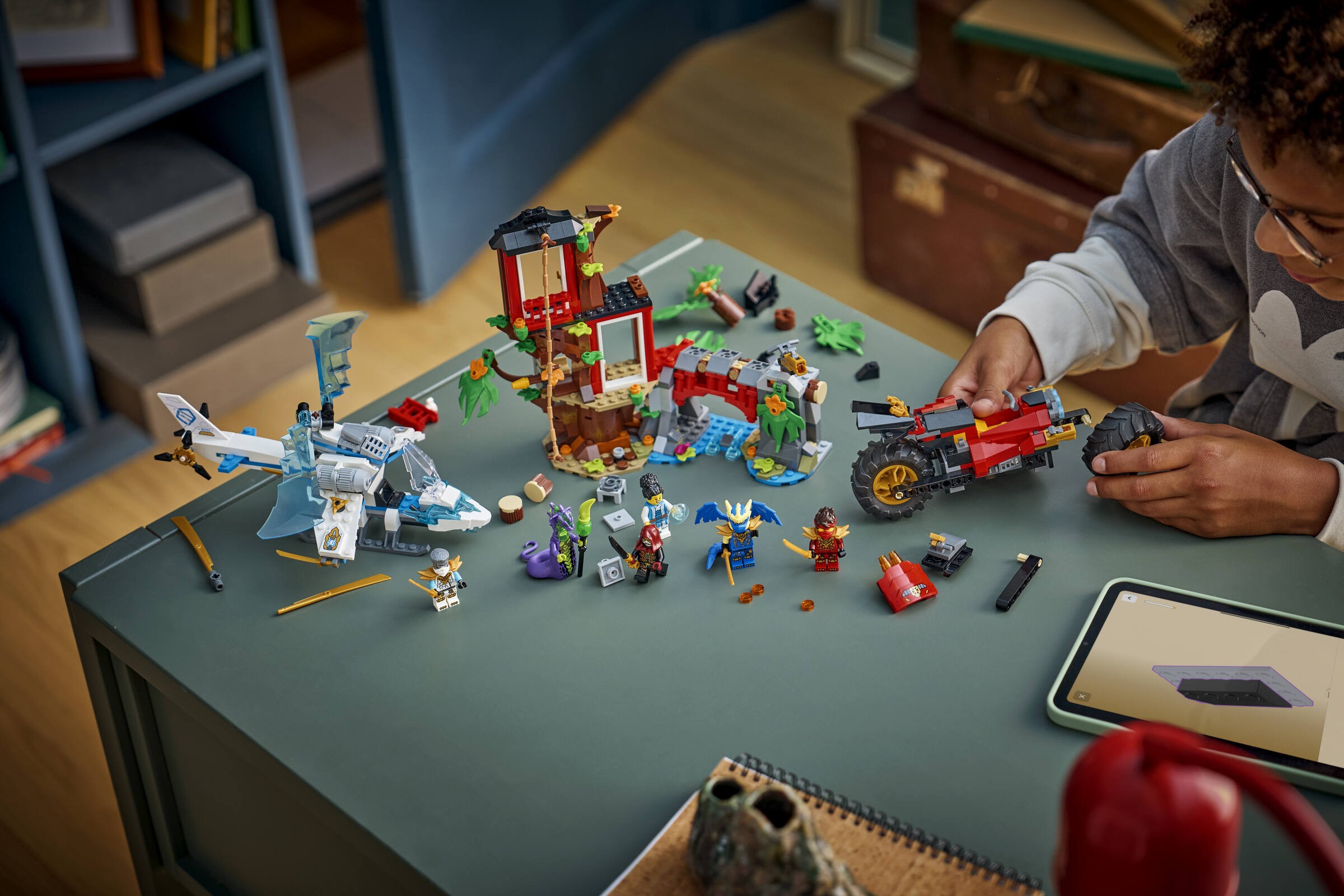 Elementy takie jak warsztat, herbaciarnia, taras czy linia z pnączy do huśtania, a także pułapki i ruchome mosty, sprawiają, że zabawa nabiera nowego wymiaru. Helikopter z otwieranym kokpitem i obracającymi się śmigłami, oraz motocykl z ruchomymi kołami i siodełkiem-kokpitem z miotaczami klocków, zapewniają nieograniczone możliwości twórczej zabawy. Nie można zapomnieć o postaciach takich jak Kai, Zane, Jay w smoczej formie, Euphrasia oraz ich oponentach - kwasowym potworze i lojaliście.