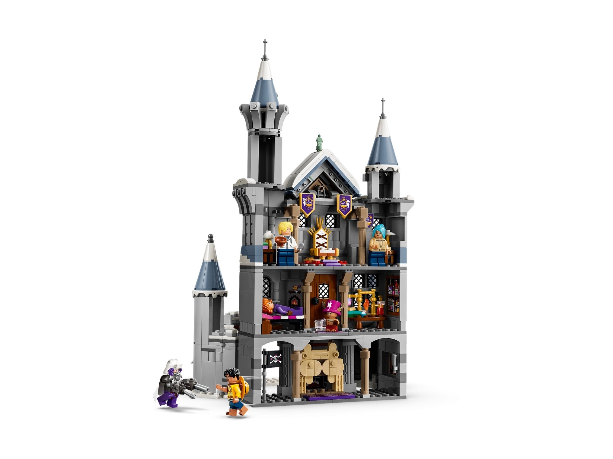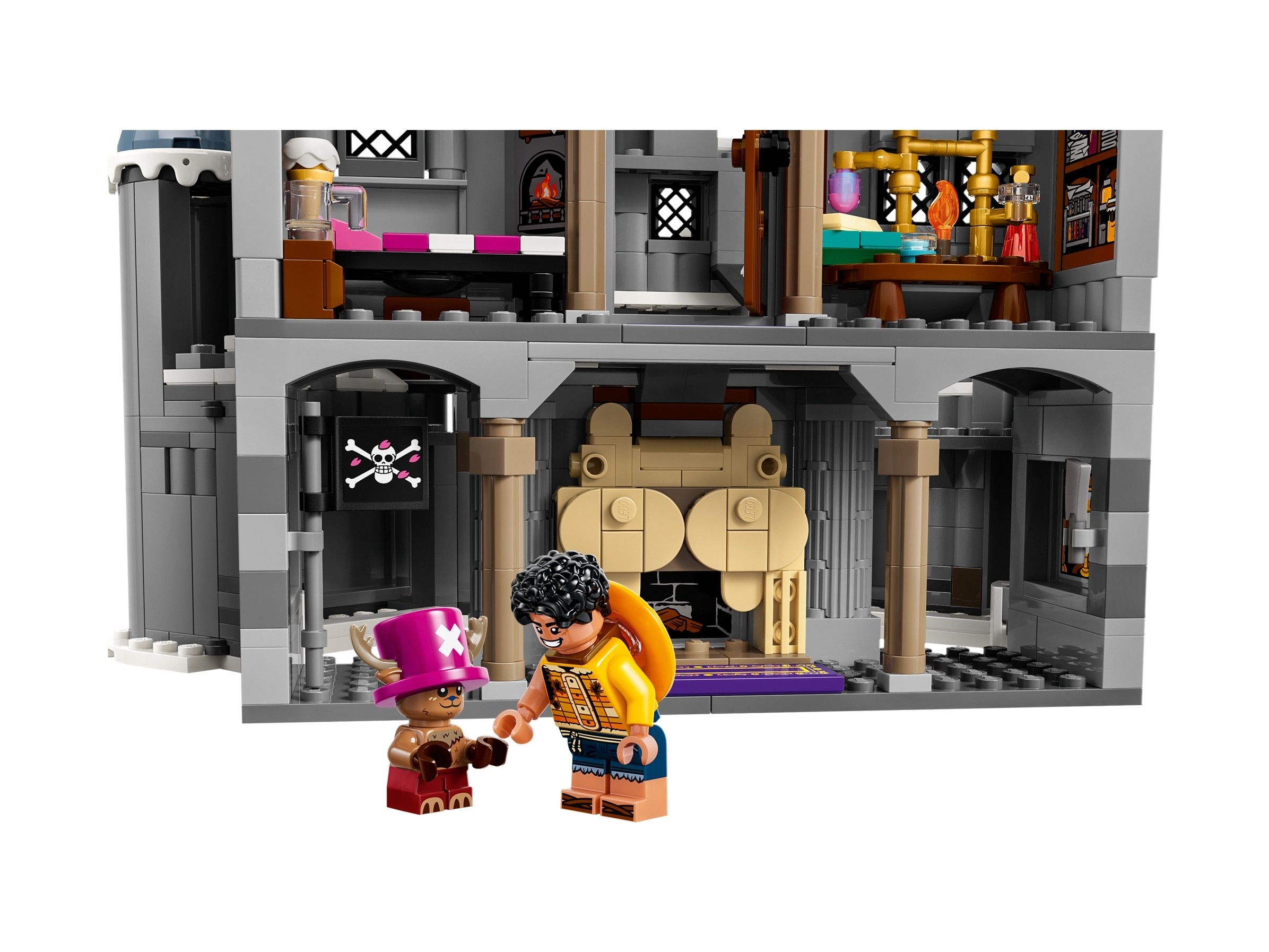 Twierdza z zestawu LEGO® Bitwa pod zamkiem Drum zachwyca szczegółowym odwzorowaniem wnętrz, takich jak kominek w kształcie hipopotama, laboratorium Choppera czy sala tronowa. Dodatkowe akcesoria, takie jak piracka flaga, sztandary czy broń umożliwiająca transformację Wapola, dodają realizmu i umożliwiają dzieciom jeszcze głębsze zanurzenie się w fabule. To nie tylko wspaniała zabawa, ale również doskonały pomysł na prezent dla młodych fanów przygód załogi Słomkowego Kapelusza.