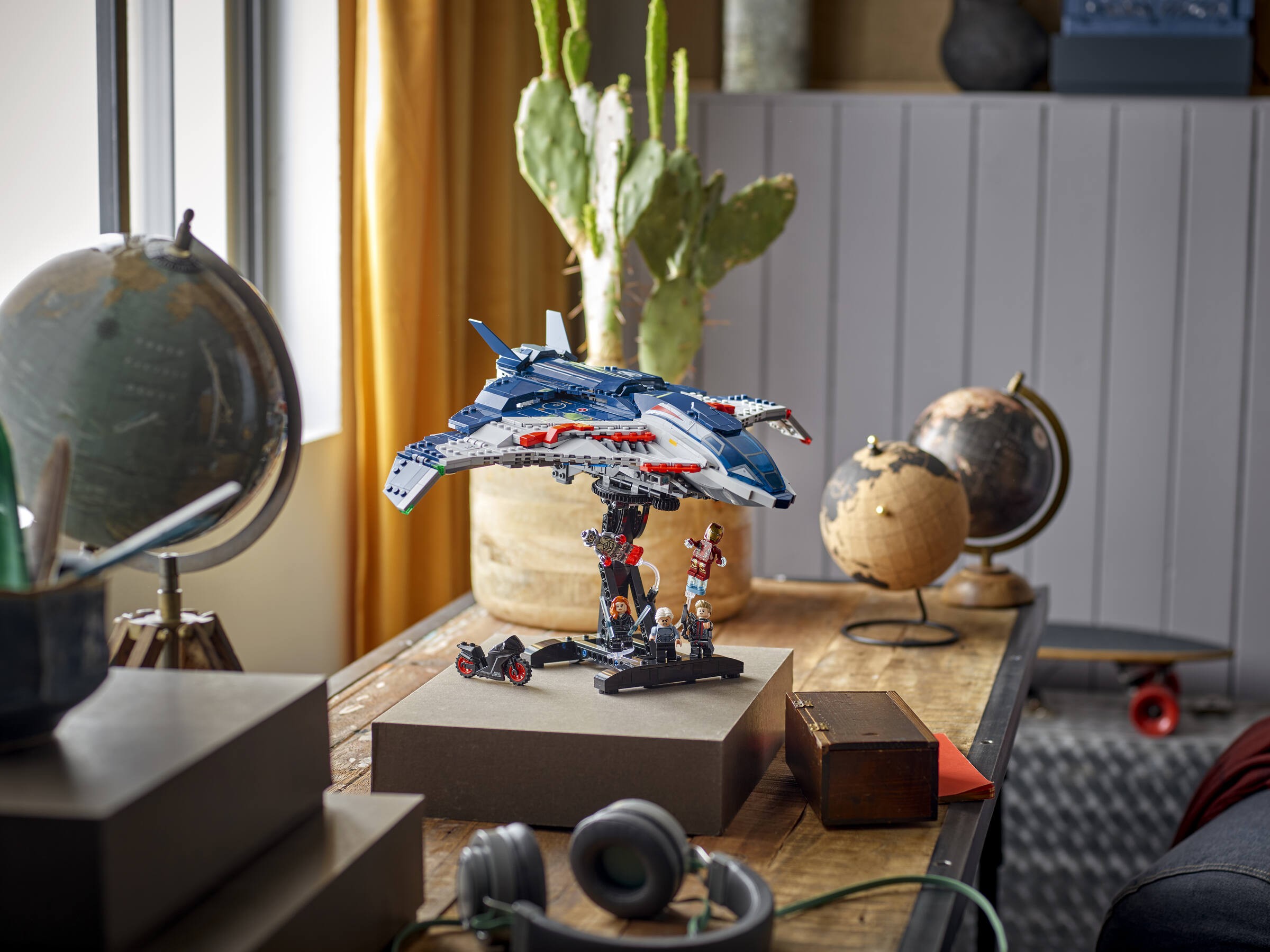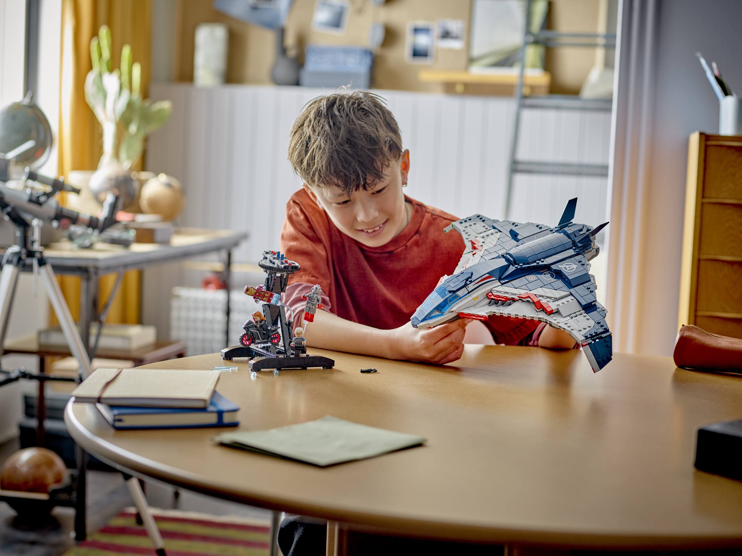 Model Quinjeta do zbudowania zawiera pięć minifigurek: Czarną Wdowę z motocyklem, Iron Mana, Quicksilvera, Ultimate Ultrona i Hawkeye’a z łukiem i strzałą. Minifigurki można przyczepić w różnych miejscach samolotu. Quinjet ma otwierany kokpit, dwa miotacze klocków z przodu oraz schowek na broń Czarnej Wdowy i łuk Hawkeye’a. Tylne drzwi otwierają się, dzięki czemu dzieci mogą wjeżdżać i wyjeżdżać motocyklem. W zestawie jest też odczepiana, obrotowa podstawka, dzięki której można podziwiać samolot z każdej perspektywy. Dodatkową, cyfrową zabawę zapewnia intuicyjna aplikacja LEGO Builder, w której konstruktorzy mogą powiększać, obracać modele w 3D i śledzić swoje postępy. Zestaw zawiera 1131 elementów.