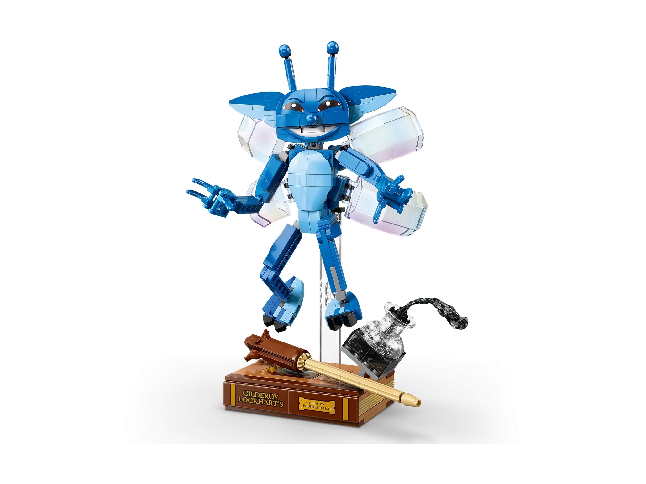 Model LEGO® Chochlik kornwalijski oferuje dzieciom możliwość kreatywnej zabawy dzięki ruchomym elementom, takim jak głowa, ręce i palce. Można ustawić go w locie lub w pozycji stojącej na przezroczystej podstawce, co czyni go doskonałym elementem kolekcji. Zawiera również kultowe akcesoria, takie jak książka Gilderoya Lockharta™ i butelka rozlanego atramentu, które dodatkowo wzbogacają całą scenę.