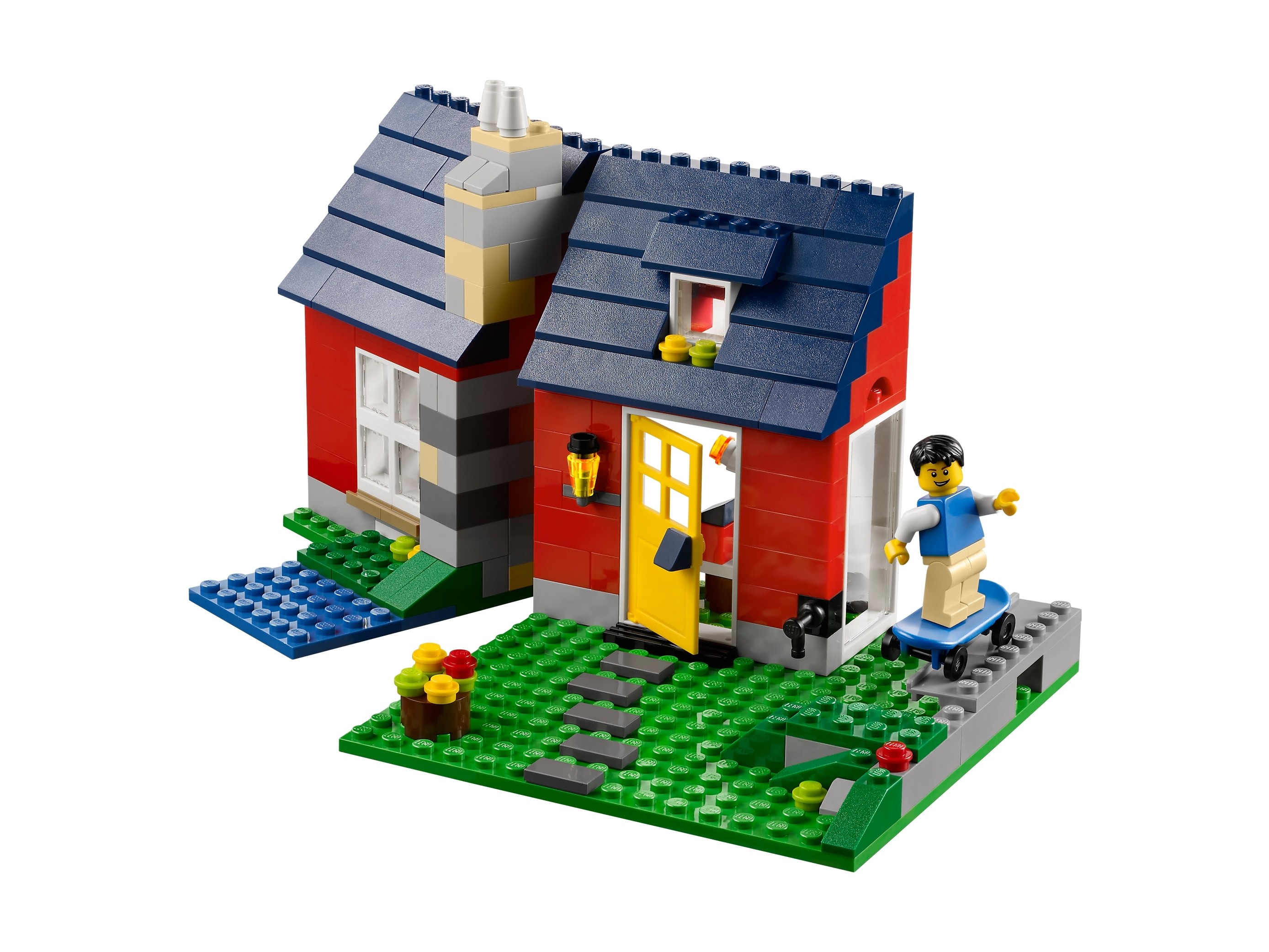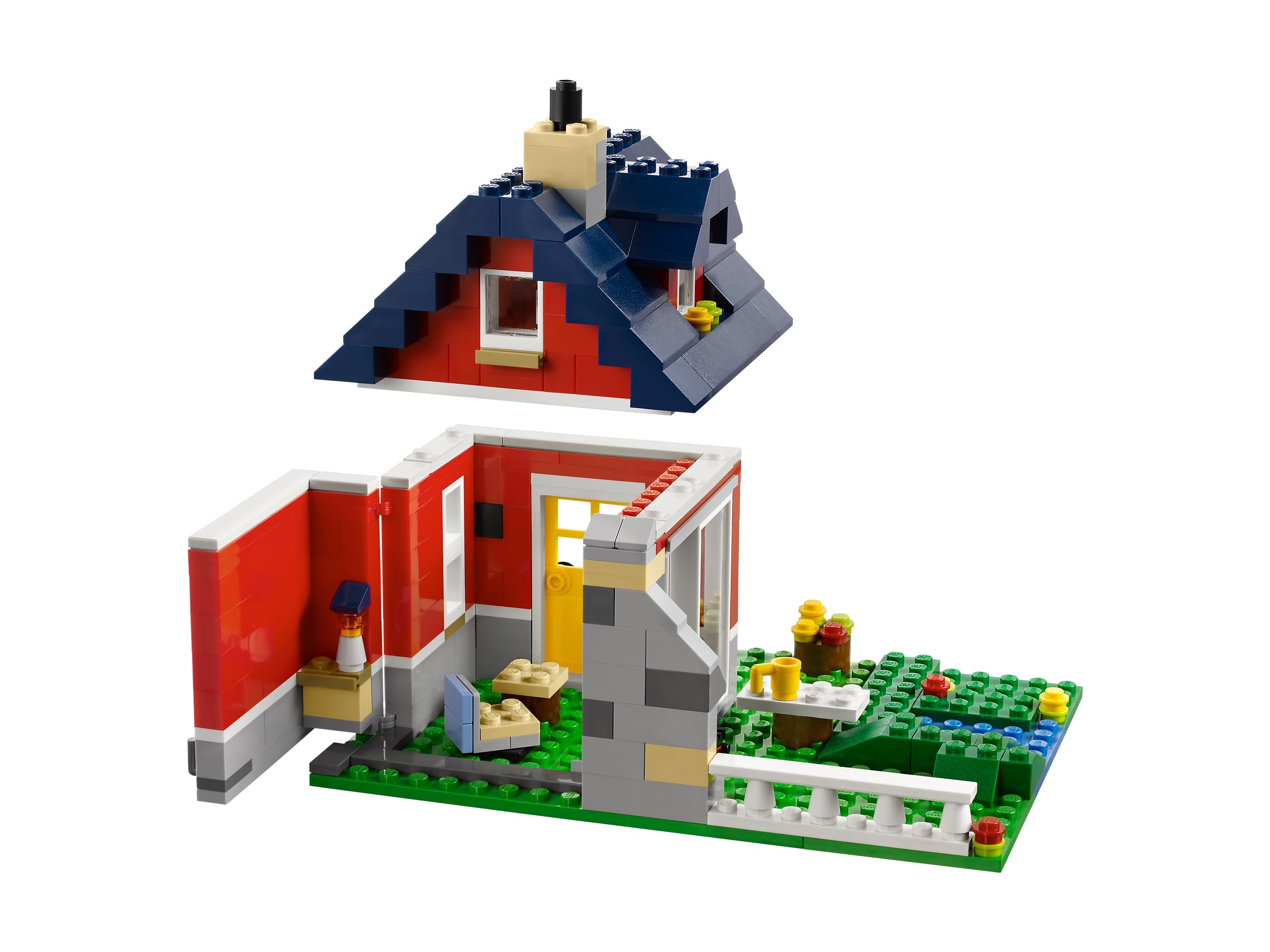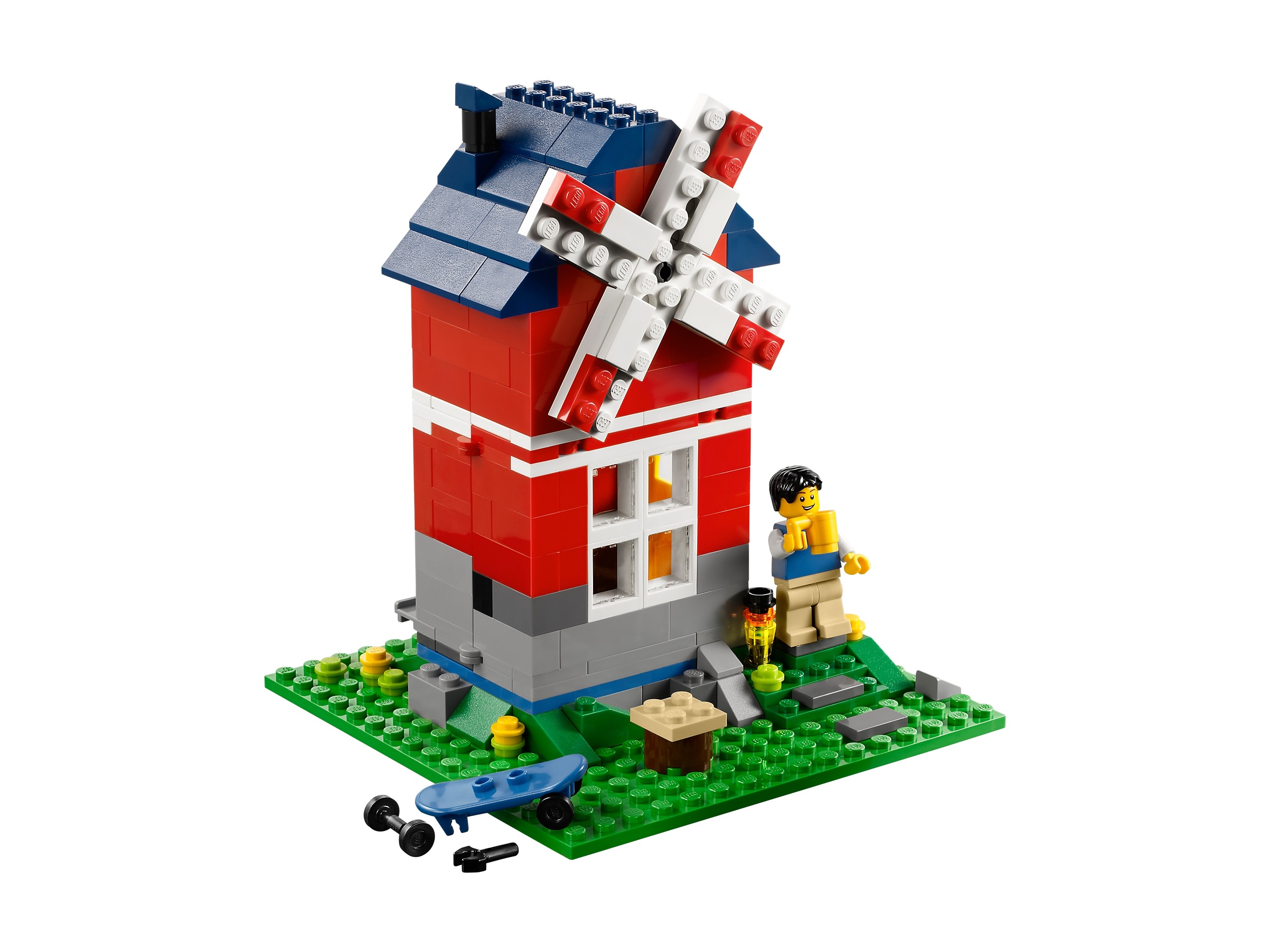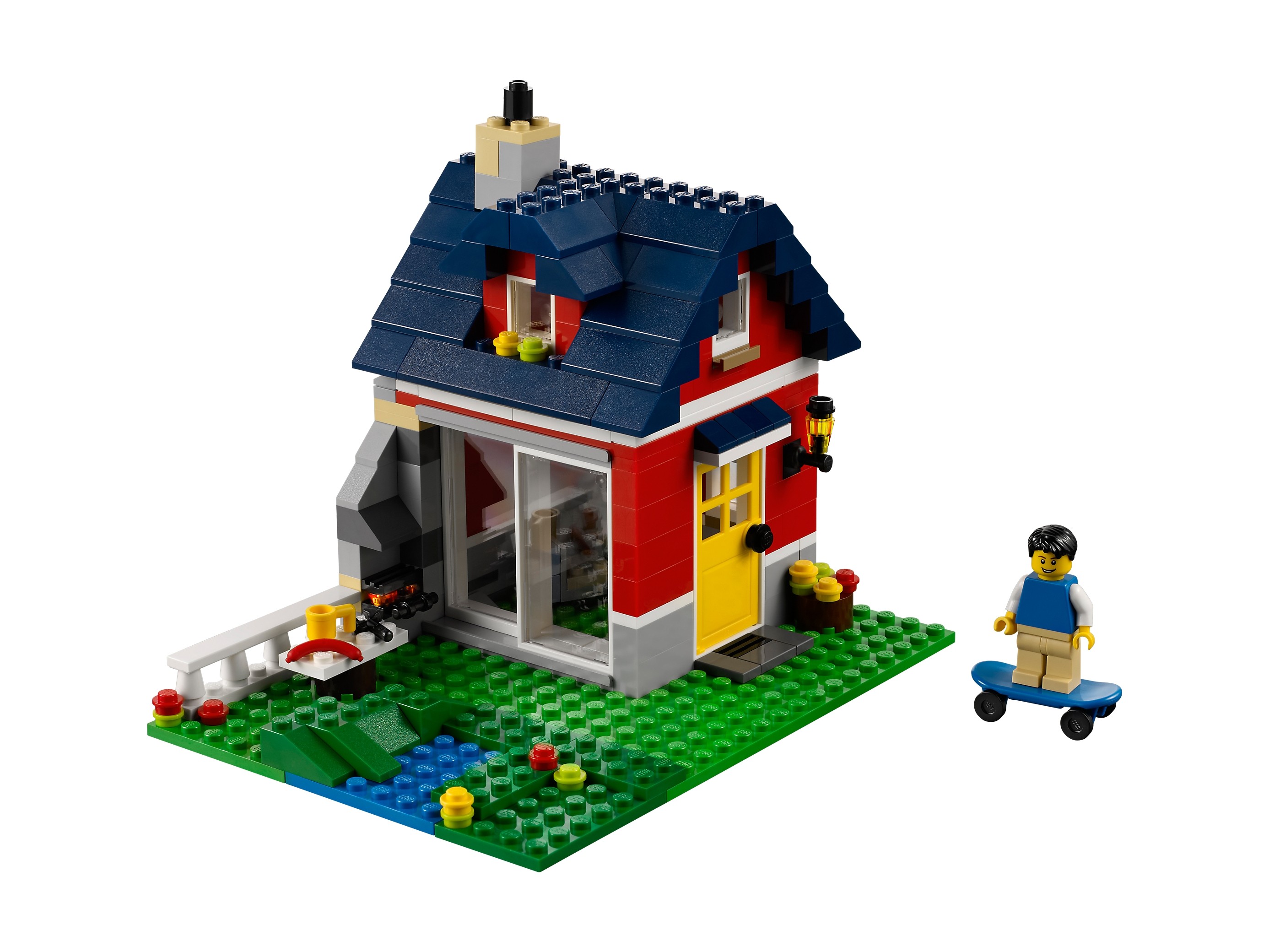 Zbuduj mały domek, służący jako letnie schronienie wakacyjne. Ta przytulna chata to zbudowane z klocków LEGO® doskonałe miejsce na urlop, w którym jest wszystko, czego minifigurka potrzebuje do odpoczynku! Wrzuć kiełbaskę na ruszt, przejedź się na deskorolce lub popływaj w jeziorku! Zdejmij dach i otwórz tył małego domku, aby poznać wnętrze! Znajdziesz tam lampę, szafki, krzesło obrotowe i stół. Model można przebudować w imponujący wiatrak lub dom deskorolkarza — równie ciekawe miejsca wakacyjneLEGO®! Otwórz dom deskorolkarza ze ścianą zamocowaną na zawiasach, aby bawić się w środku lub bierz się za najtrudniejsze ewolucje! Rozkręć skrzydła wiatraka i użyj klucza, aby go naprawić! Zawiera minifigurkę.