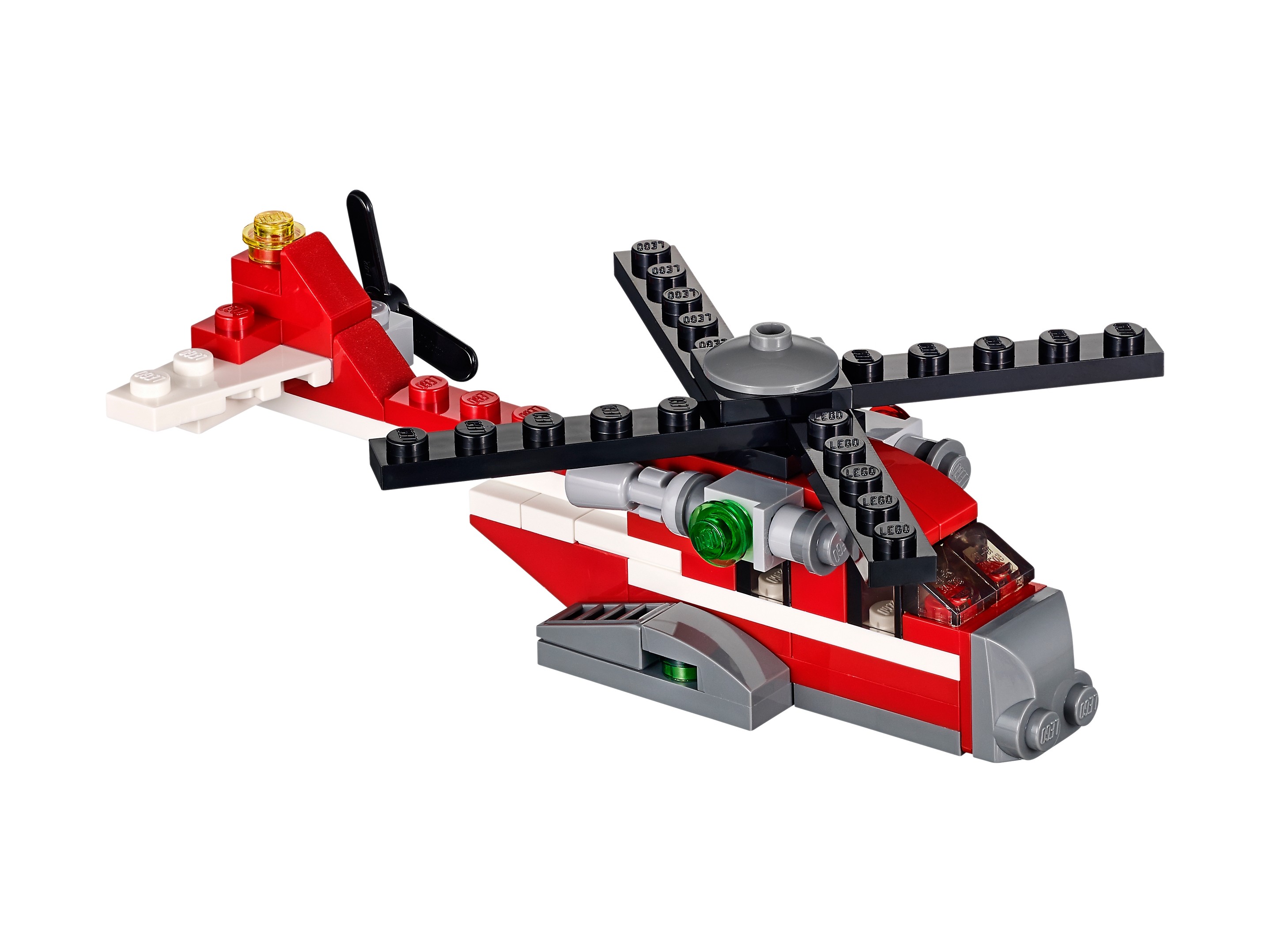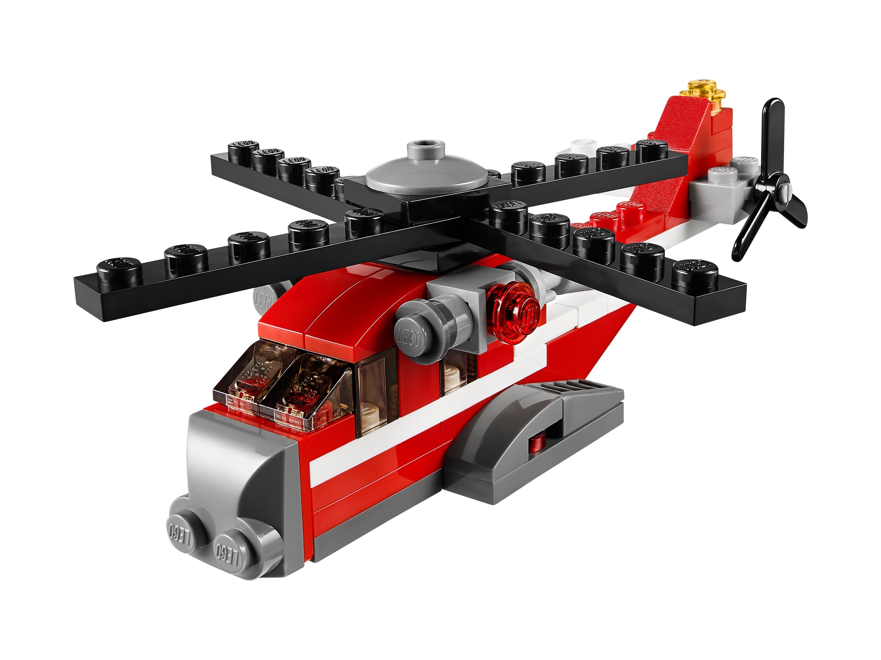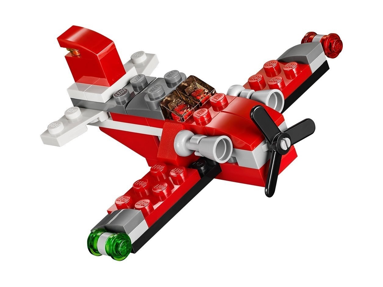 Potężny helikopter transportowy Czerwony Grom jest idealny do przewożenia ciężkich ładunków w odległe, górzyste tereny. Widoczna z daleka czerwona, biała i szara farba oraz potężne silniki czynią też z niego świetny helikopter ratowniczy. A najlepsze jest to, że możesz go przerobić na stylowy, staroświecki dwupłatowiec lub wyścigową motorówkę.