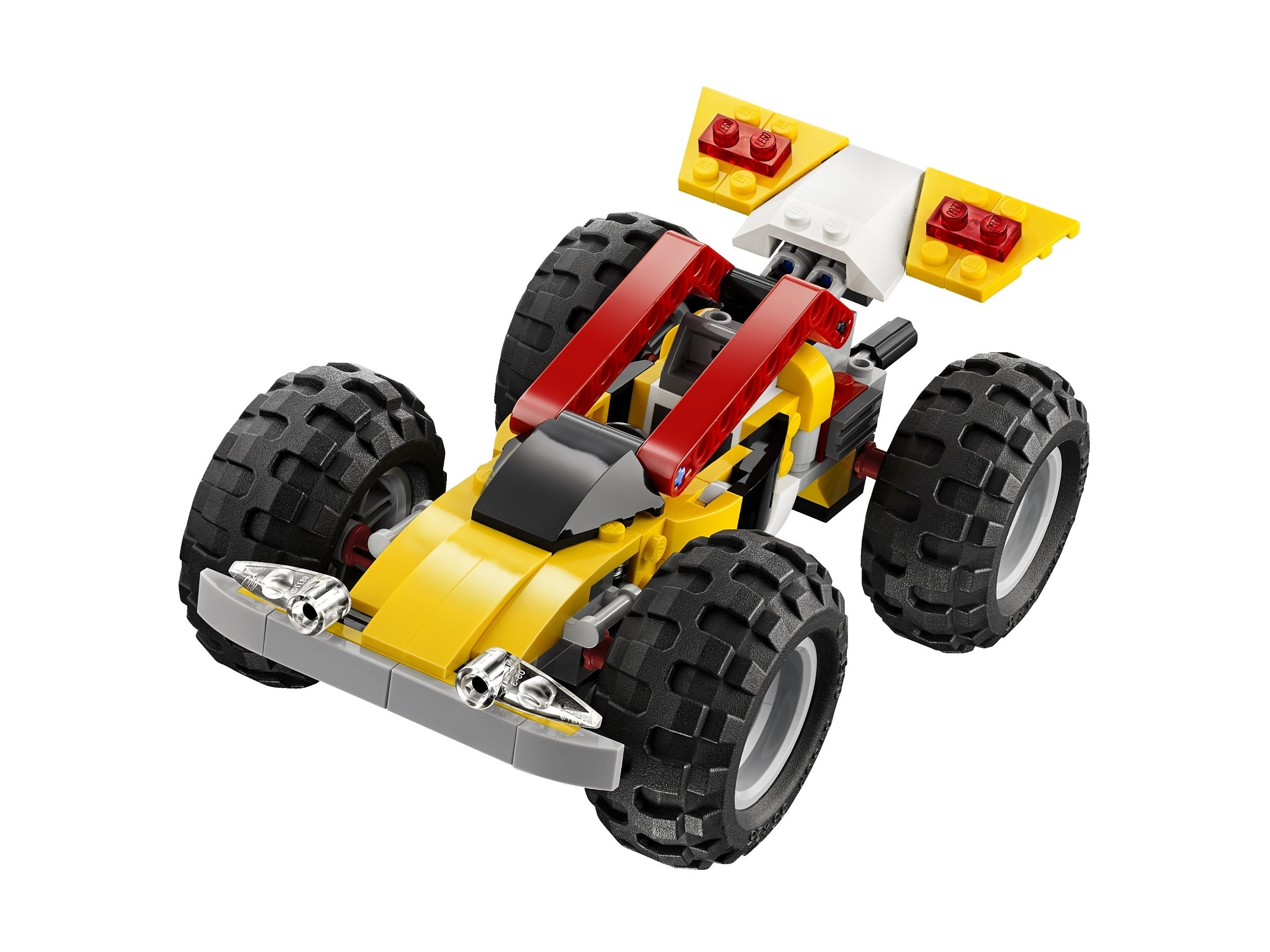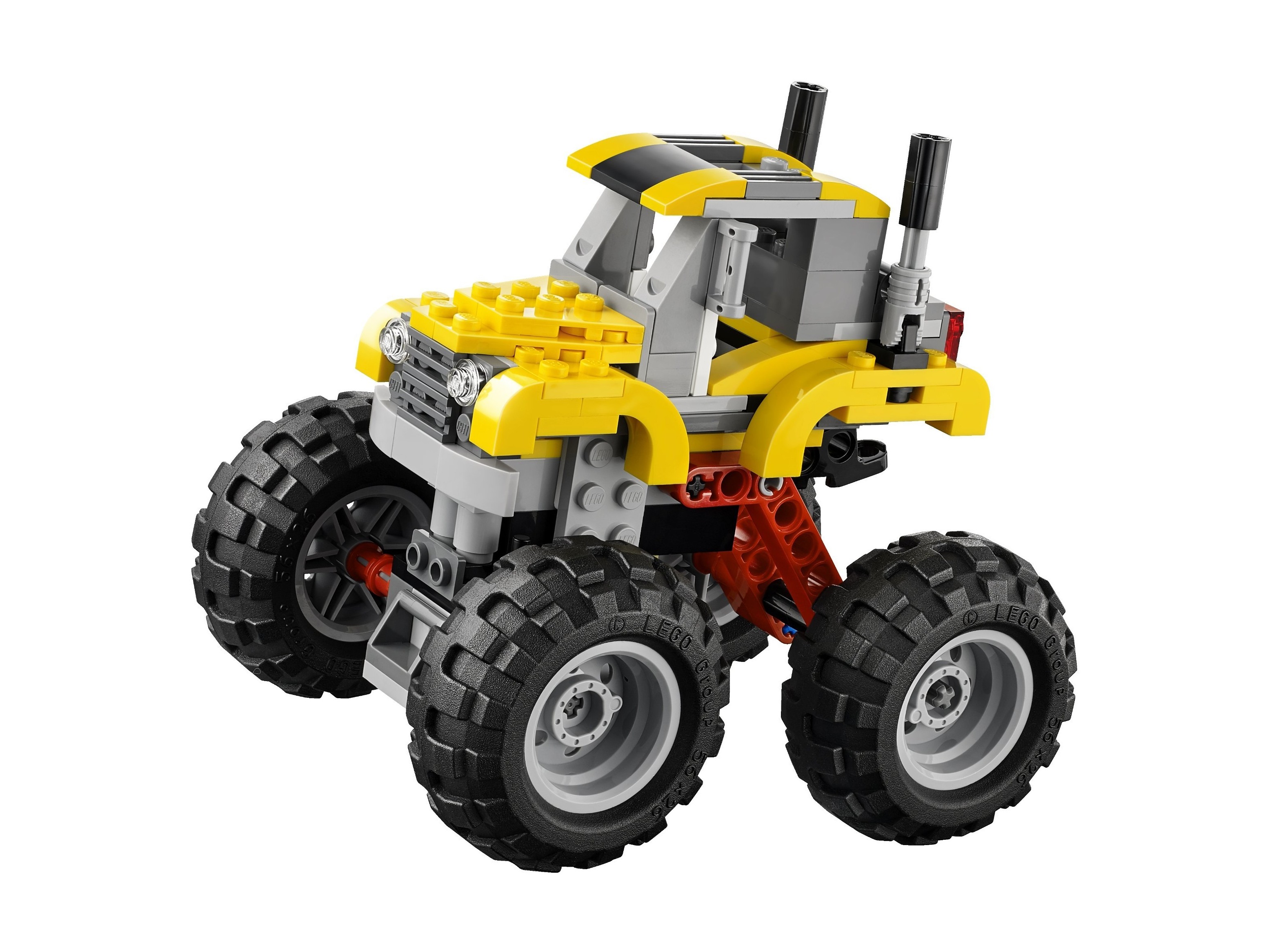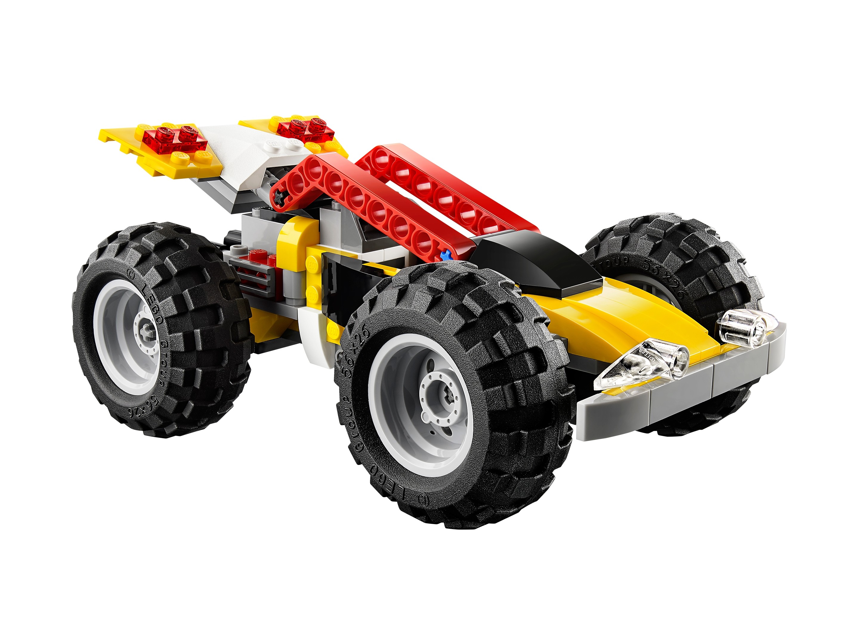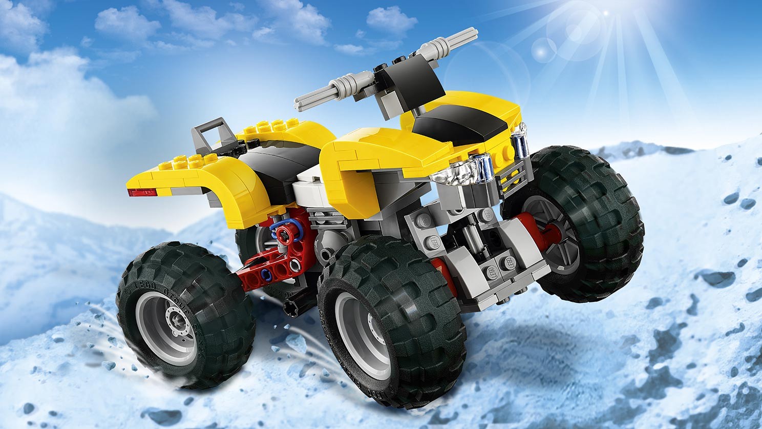 Wskakuj w Quada i ruszaj szukać przygód w terenie! Dzięki działającej kierownicy i tylnemu zawieszeniu jest gotów na każe wyzwanie. Ma też szczegółowy silnik, przednie światła i mocne opony, więc budując go, możesz się popisać umiejętnościami. Gdy przyjdzie pora na zmiany, możesz przerobić go na potężną ciężarówkę lub fajny pojazd terenowy.
