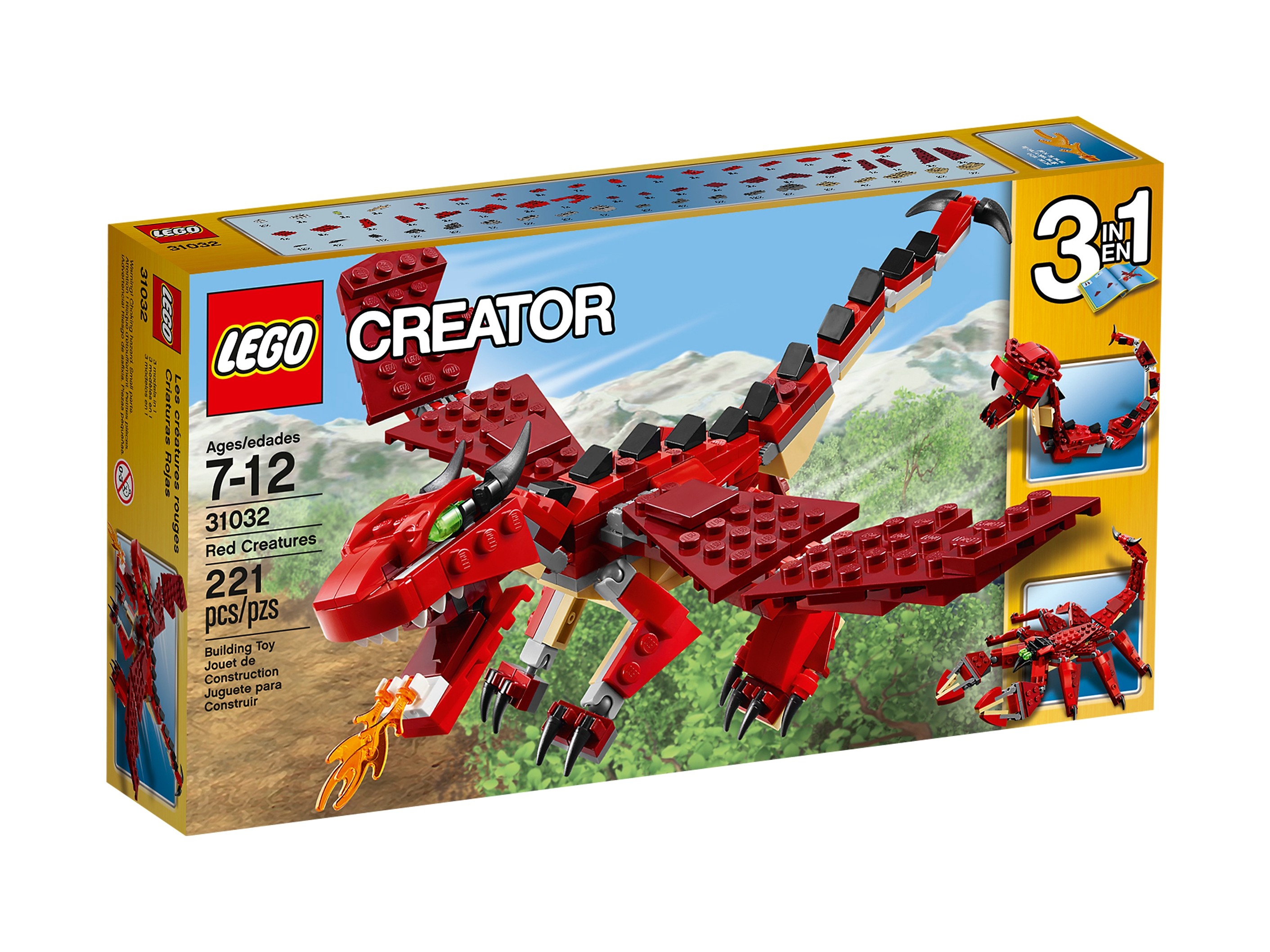 Zestaw klocków LEGO 31032 Czerwone kreatury został pokazany w 2015 roku i składa się z 221 klocków LEGO®. Klocki przeznaczone są dla dzieci powyżej 7 roku życia. Kod UPC zestawu klocków LEGO® Czerwone kreatury to: 673419229937.