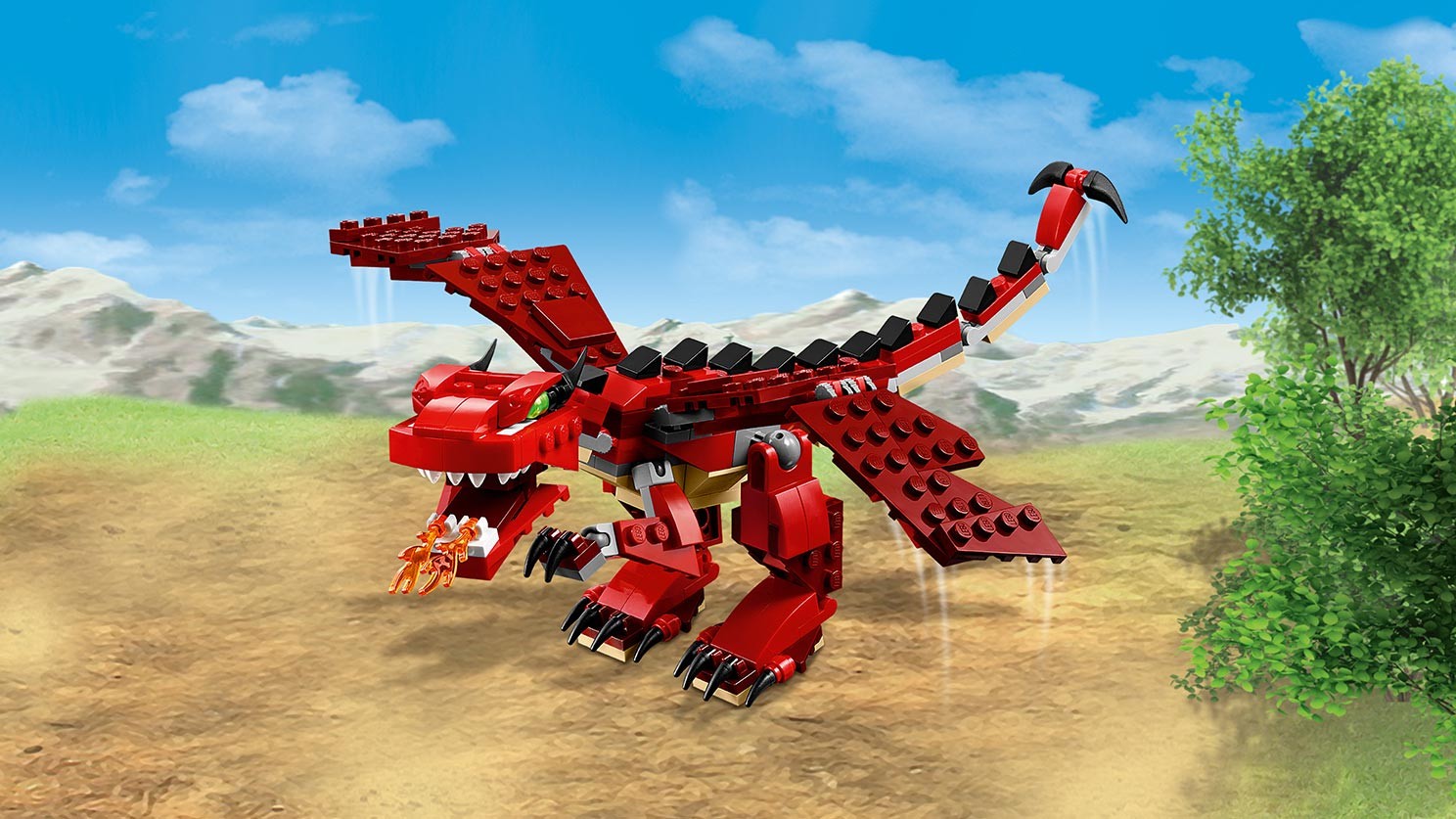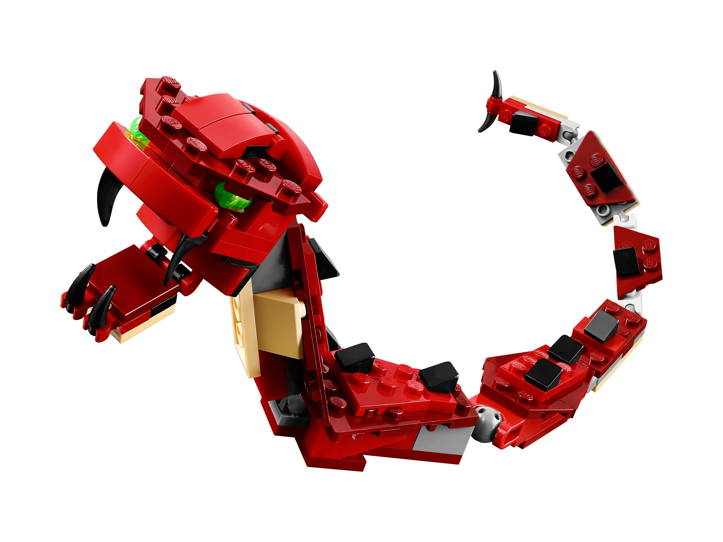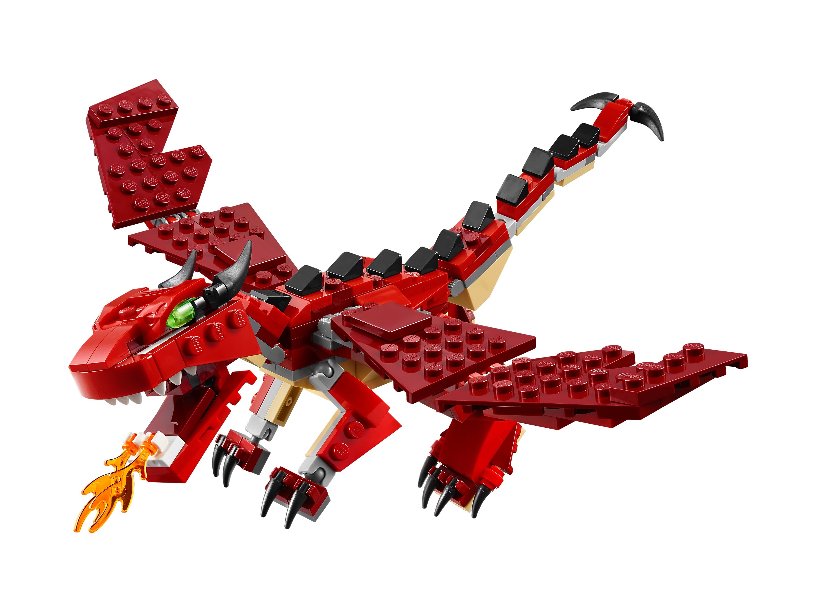 Wzbij się w przestworza wraz z zionącym ogniem smokiem z serii czerwonych kreatur! Główne cechy tego niesamowitego modelu typu 3 w 1 to klasyczna kolorystyka łącząca czerwień, jasny brąz i czerń, duże, ruchome skrzydła, długi, łuskowaty ogon, ognisty oddech, rogi, długie pazury i jasnozielone oczy. Krocz pośród drzew i lataj ponad wysokimi górami! Gdy zakończysz swoją smoczą opowieść, możesz zbudować siejącego grozę węża lub 6-nogiego skorpiona.