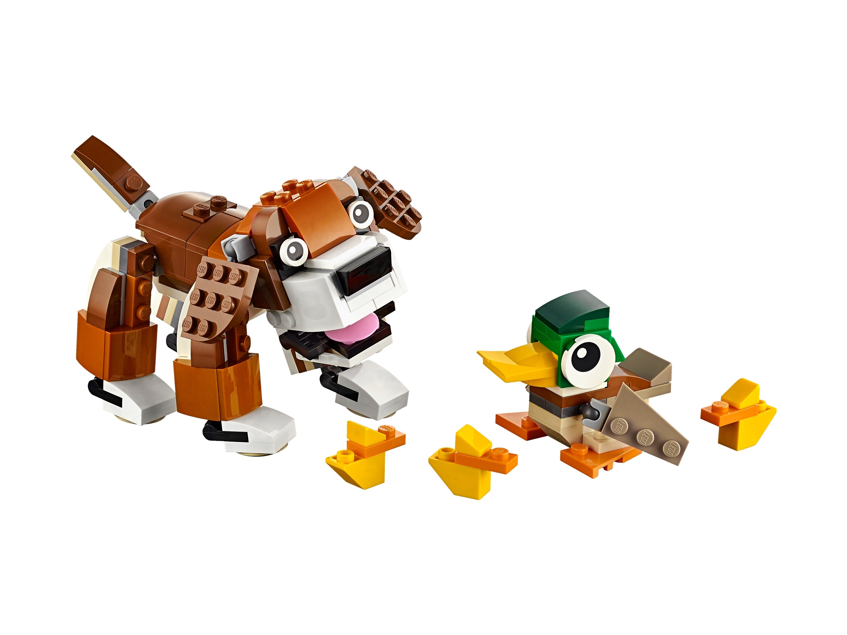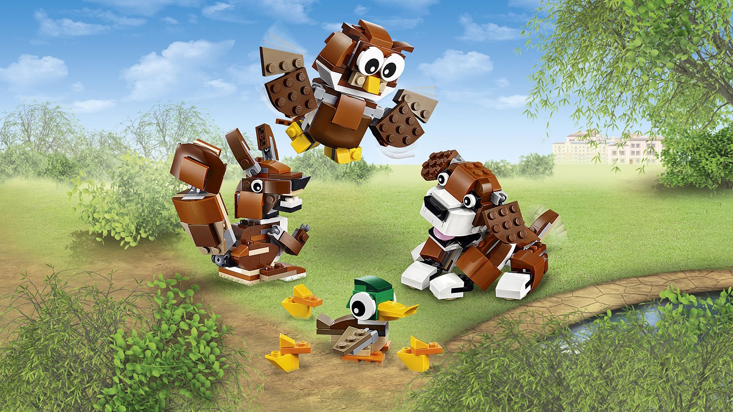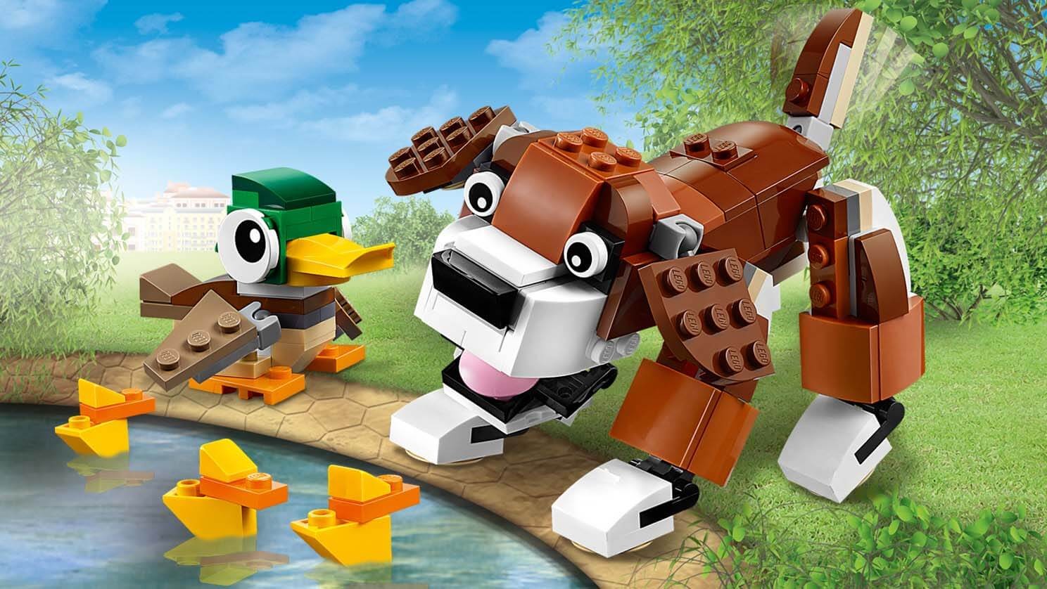 Zwierzaki z parku chcą się z tobą pobawić! W zestawie znajdziesz wesołego psa i troskliwą mamę-kaczkę z kaczętami, jedno i drugie w realistycznych kolorach. pies ma ruchome łapy i uszy, a gdy otworzysz mu paszczę, pokaże różowy język. Kaczka ma ruchome skrzydła i głowę. Jest to zestaw LEGO® Creator typu „3 w 1”, więc podstawowe modele możesz w każdej chwili przerobić na wiewiórkę lub sowę.