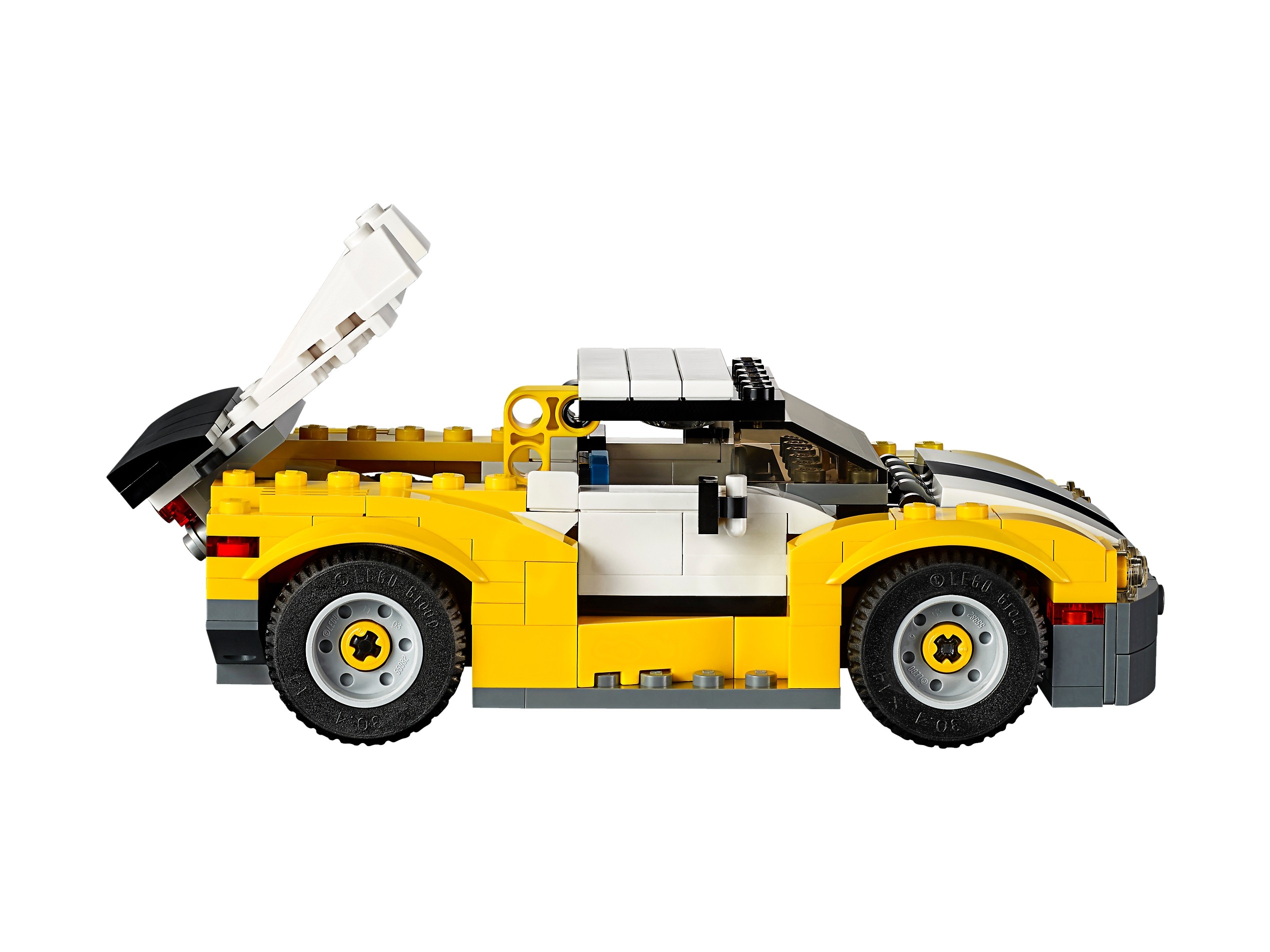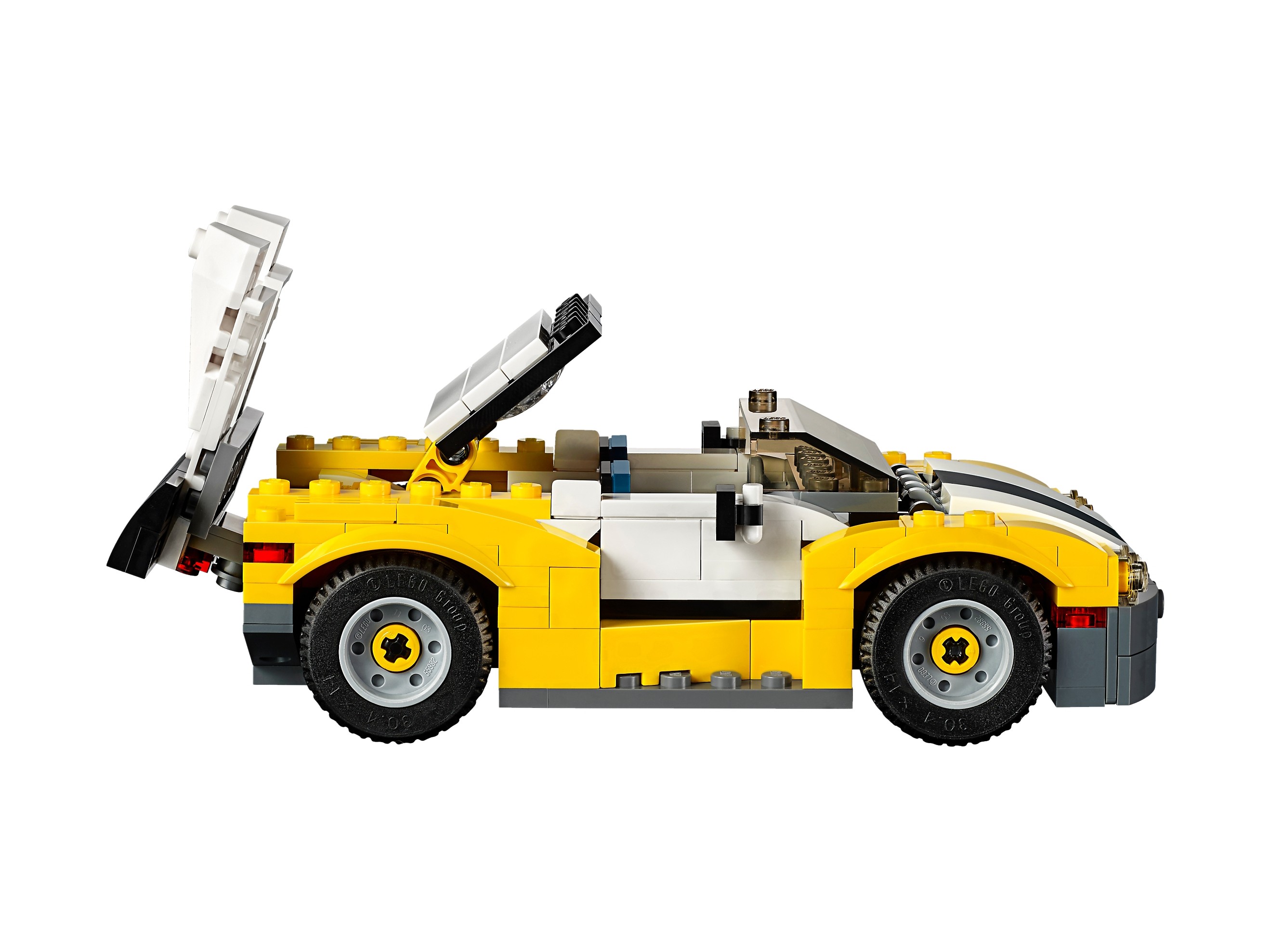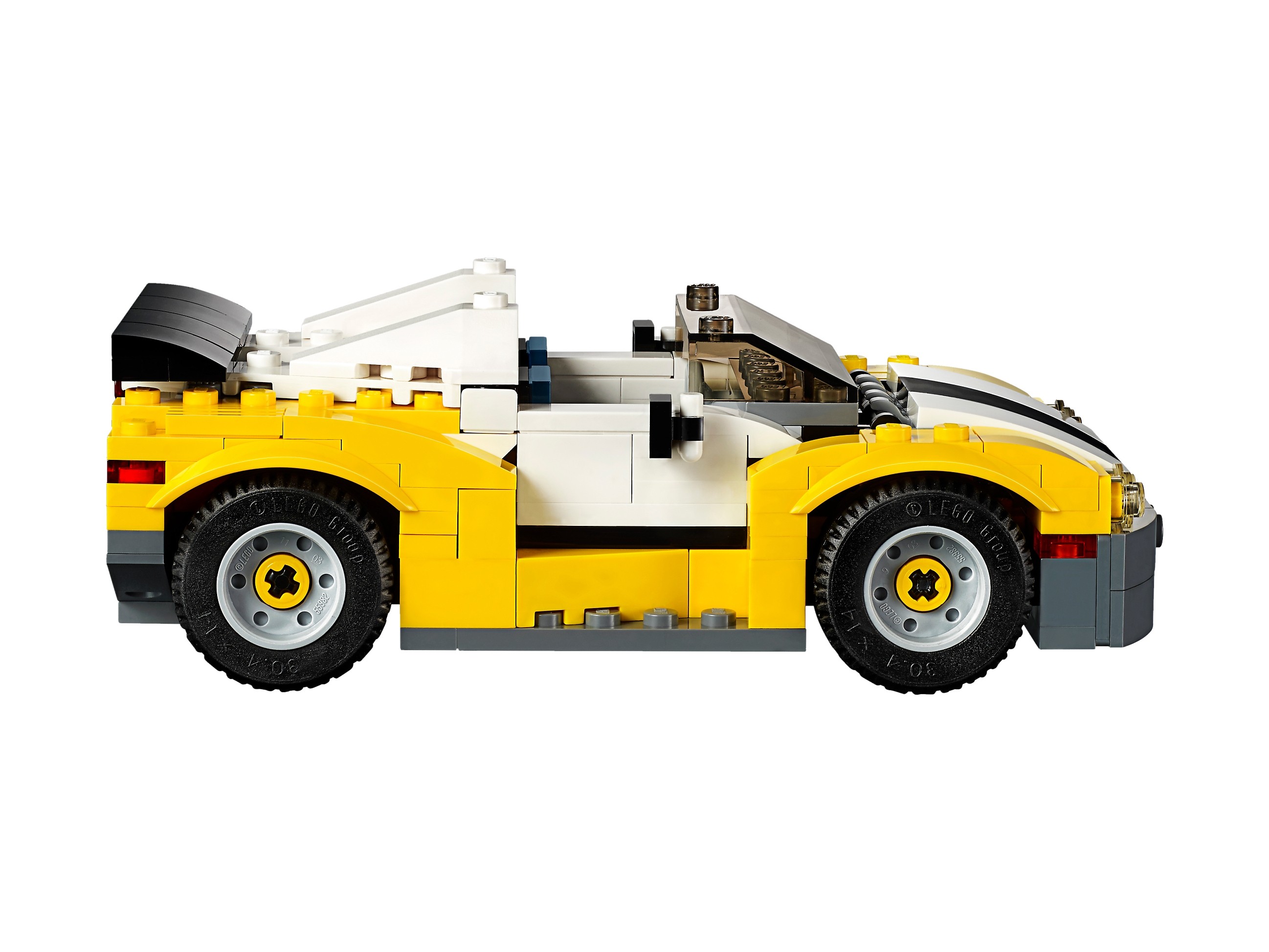 Żółto-biało-czarne auto z zestawu Szybki samochód pozwoli ci posmakować radości ze sportowej jazdy. Ma duży spojler, obręcze wyglądające jak aluminiowe, niskoprofilowe opony, otwierany dach i silnik, na którym widać wszystkie szczegóły budowy. Drzwi otwierają się do góry, a pod składanym dachem kryje się duża kabina z miejscem na 2 minifigurki (nie ma ich w zestawie). Ten model „3 w 1” z serii LEGO® Creator dostarcza potrójnej przyjemności — możesz go przerobić na pickupa lub ładowarkę burtową.