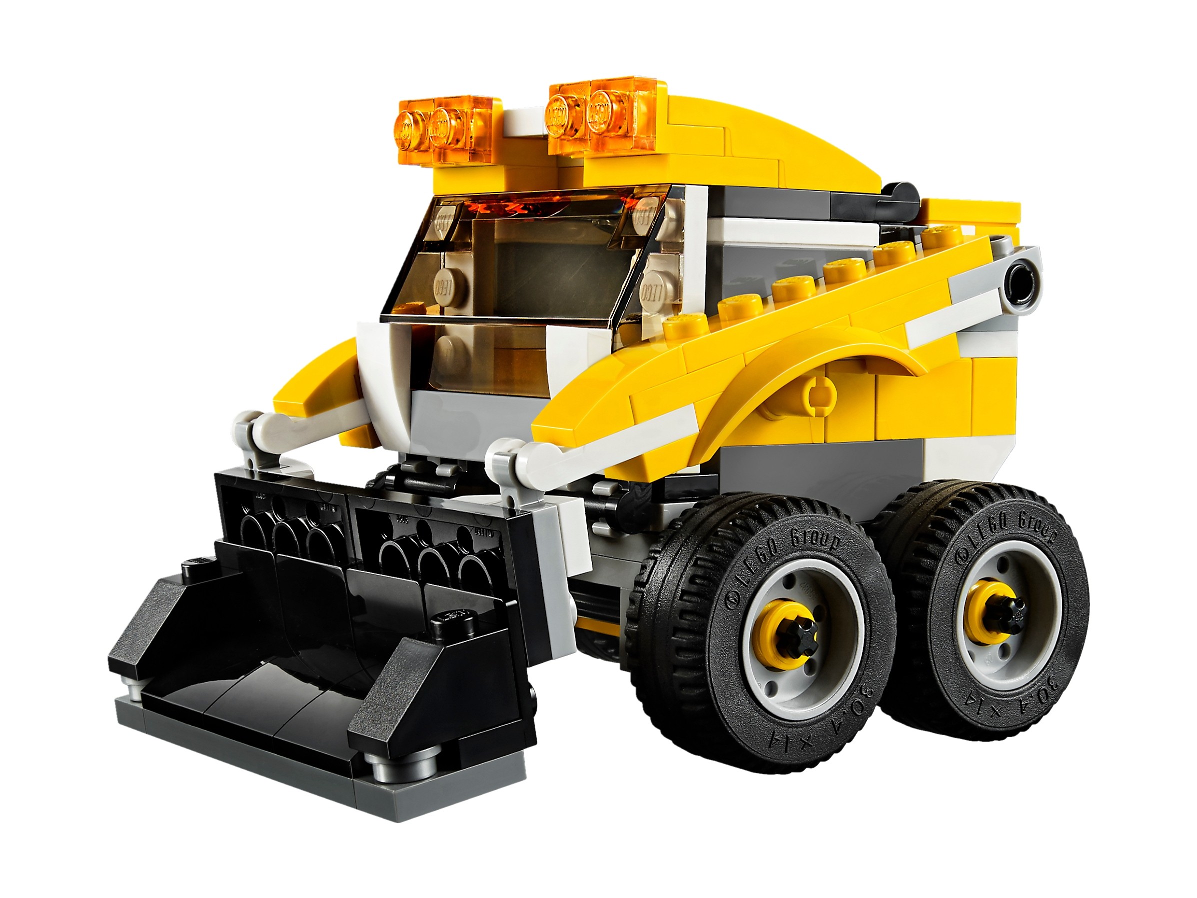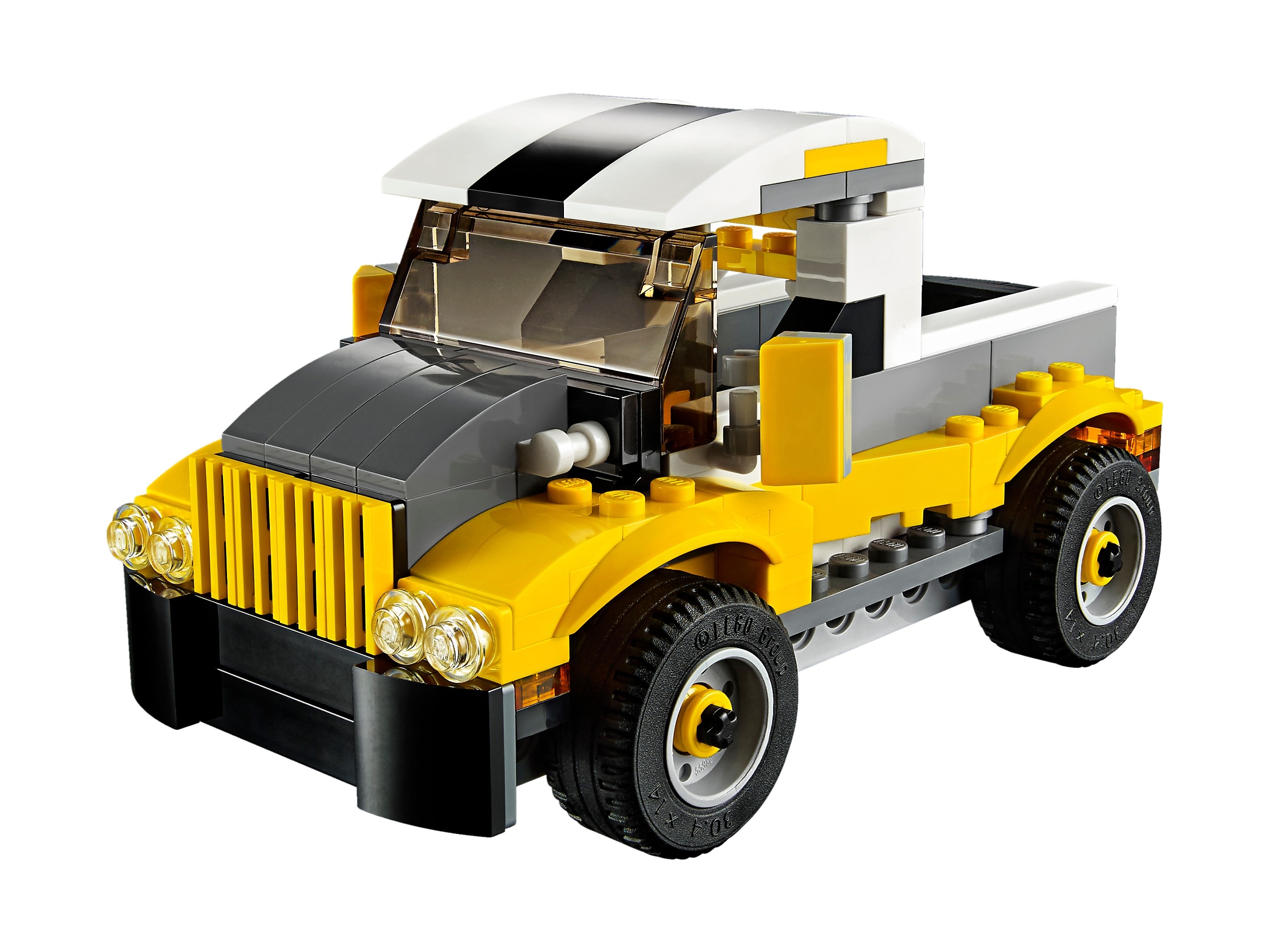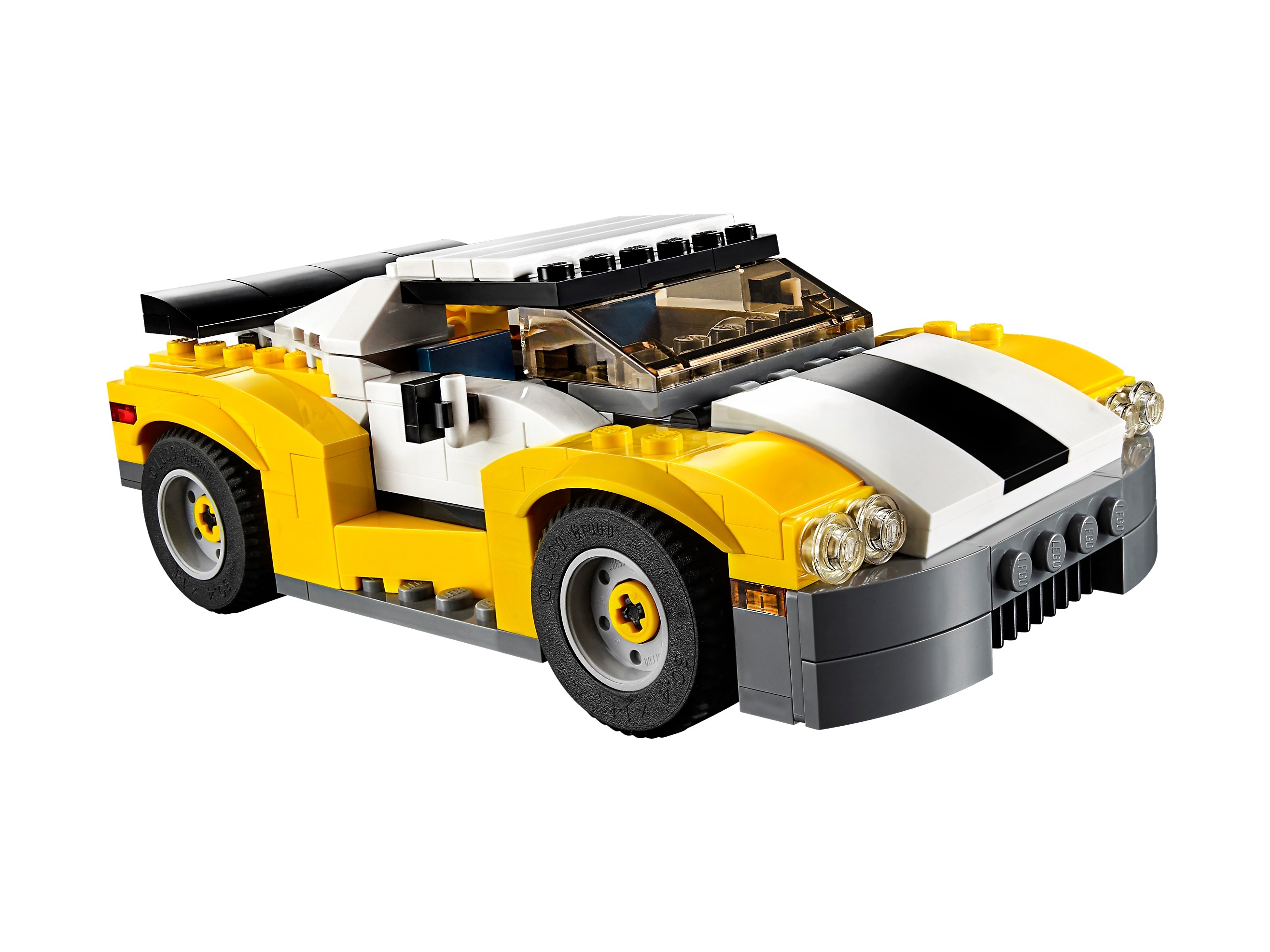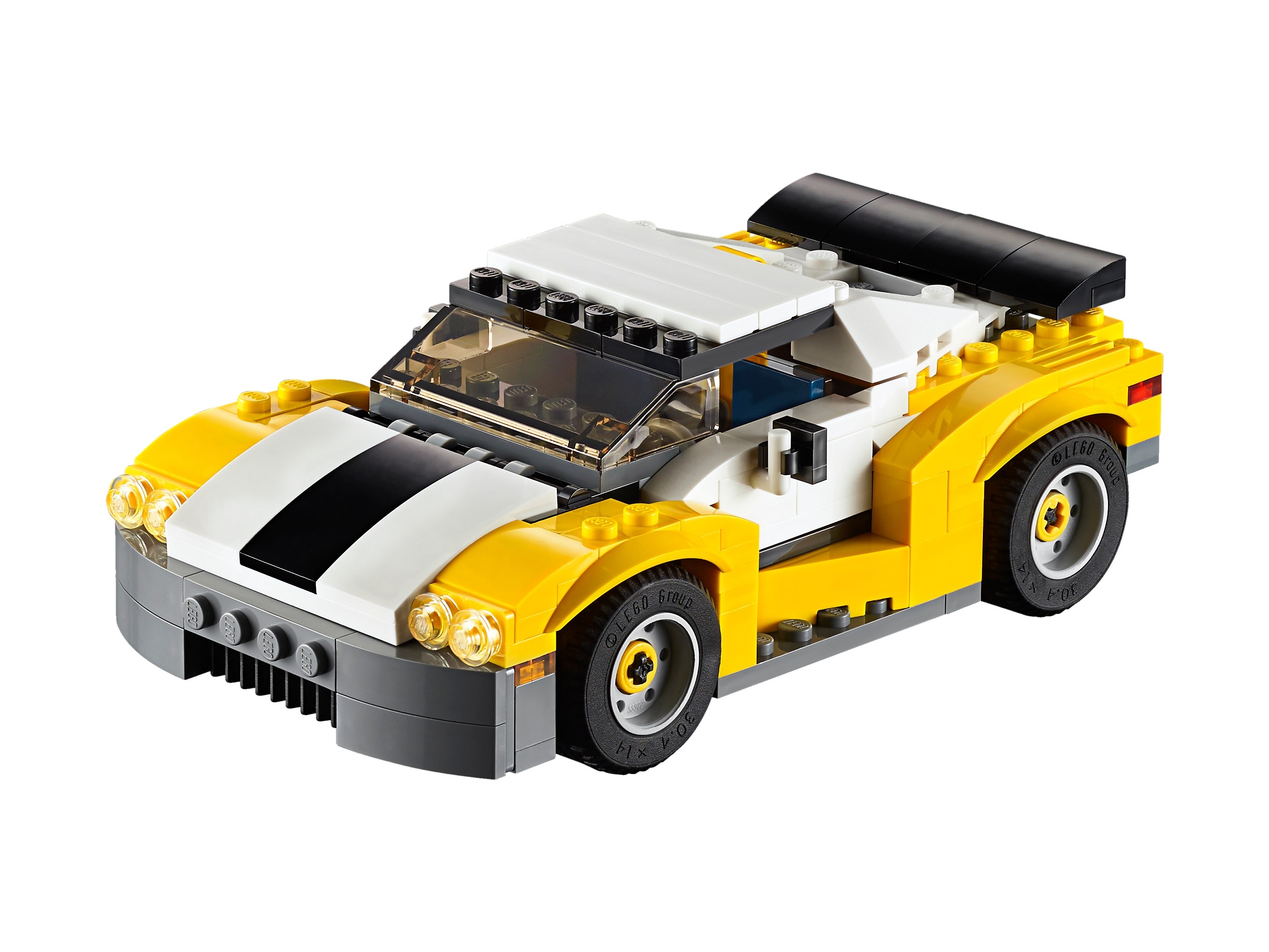 Żółto-biało-czarne auto z zestawu Szybki samochód pozwoli ci posmakować radości ze sportowej jazdy. Ma duży spojler, obręcze wyglądające jak aluminiowe, niskoprofilowe opony, otwierany dach i silnik, na którym widać wszystkie szczegóły budowy. Drzwi otwierają się do góry, a pod składanym dachem kryje się duża kabina z miejscem na 2 minifigurki (nie ma ich w zestawie). Ten model „3 w 1” z serii LEGO® Creator dostarcza potrójnej przyjemności — możesz go przerobić na pickupa lub ładowarkę burtową.