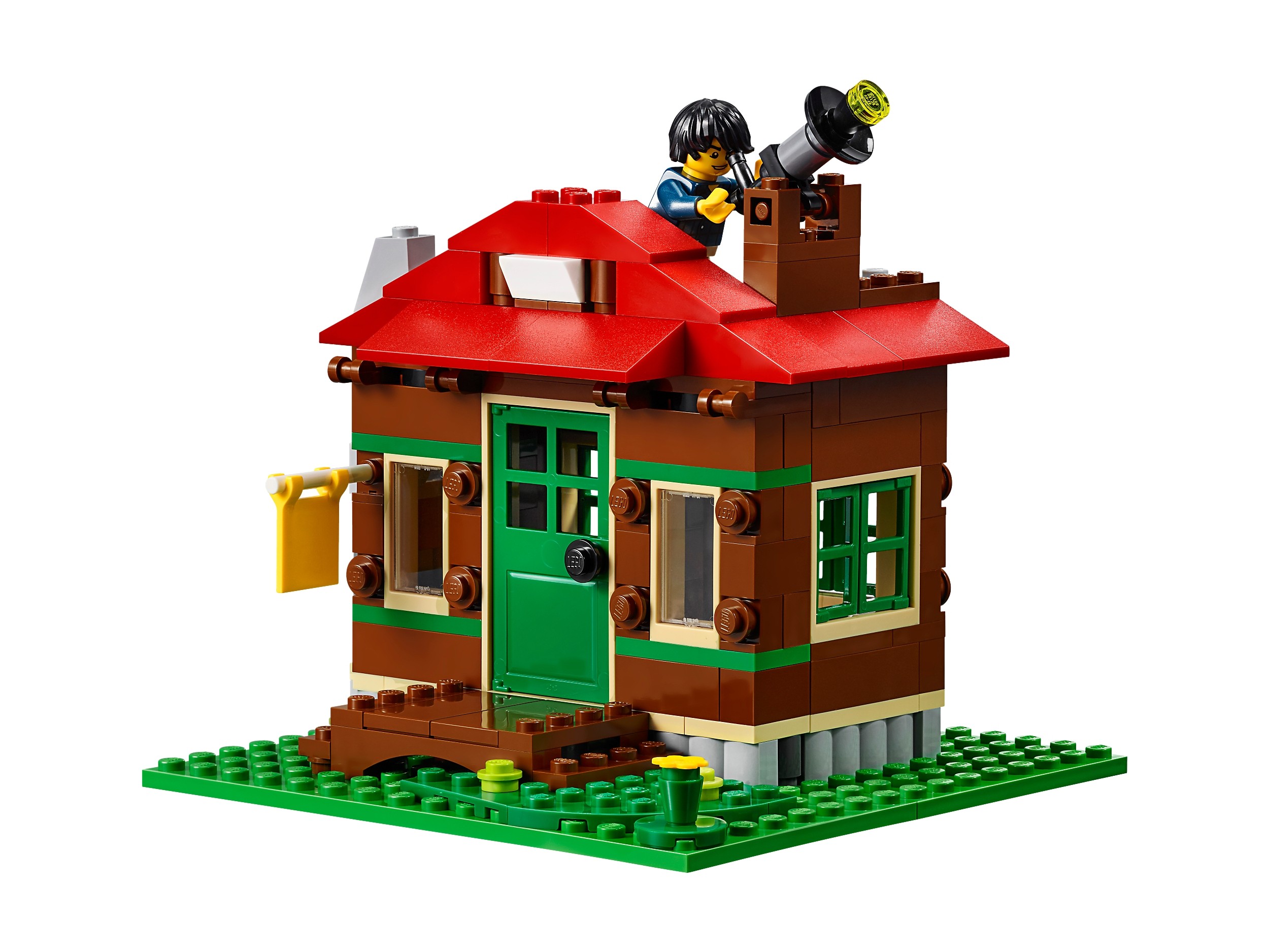 Chatka nad jeziorem to wymarzone miejsce na wypoczynek. Jest utrzymana w kolorach czerwieni, brązu, zieleni i błękitu. Ma balkon, lampę ścienną, ognisko, lilie wodne, miejsce do rąbania drewna i sosnę. W pieczołowicie urządzonym wnętrzu znajdziesz piec, łóżko i stół. Ten zestaw LEGO® Creator typu „3 w 1” pozwala zbudować dwa modele alternatywne — obserwatorium i mały domek. Każdy model rozkłada się, zapewniając dostęp do wnętrza. W zestawie minifigurka mężczyzny, a także łoś i żaba.