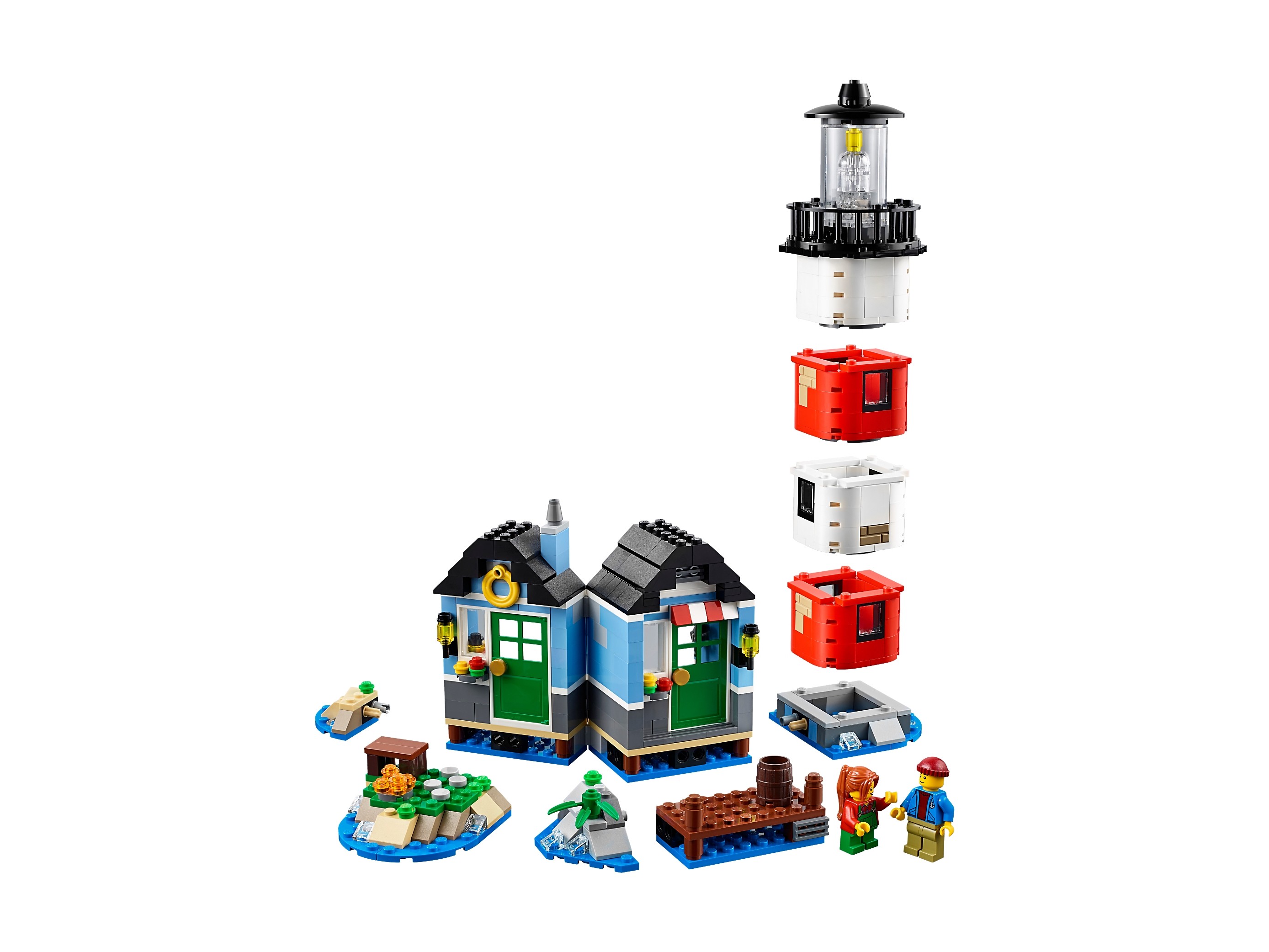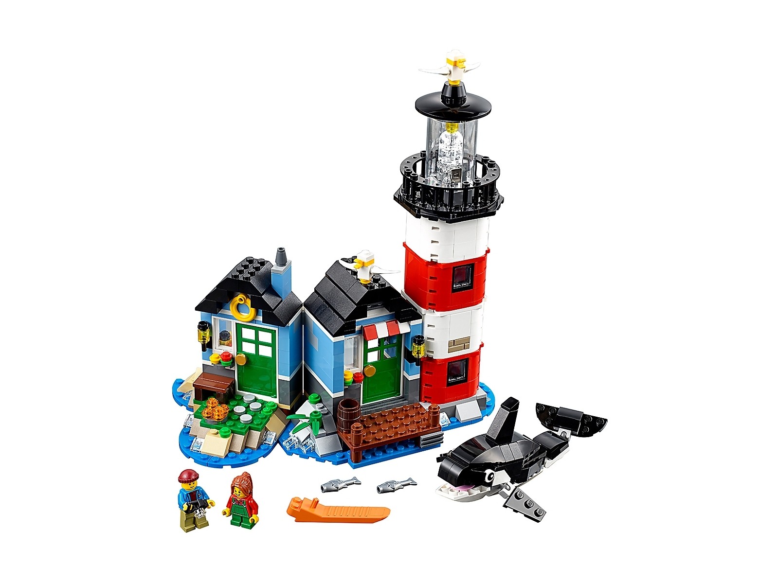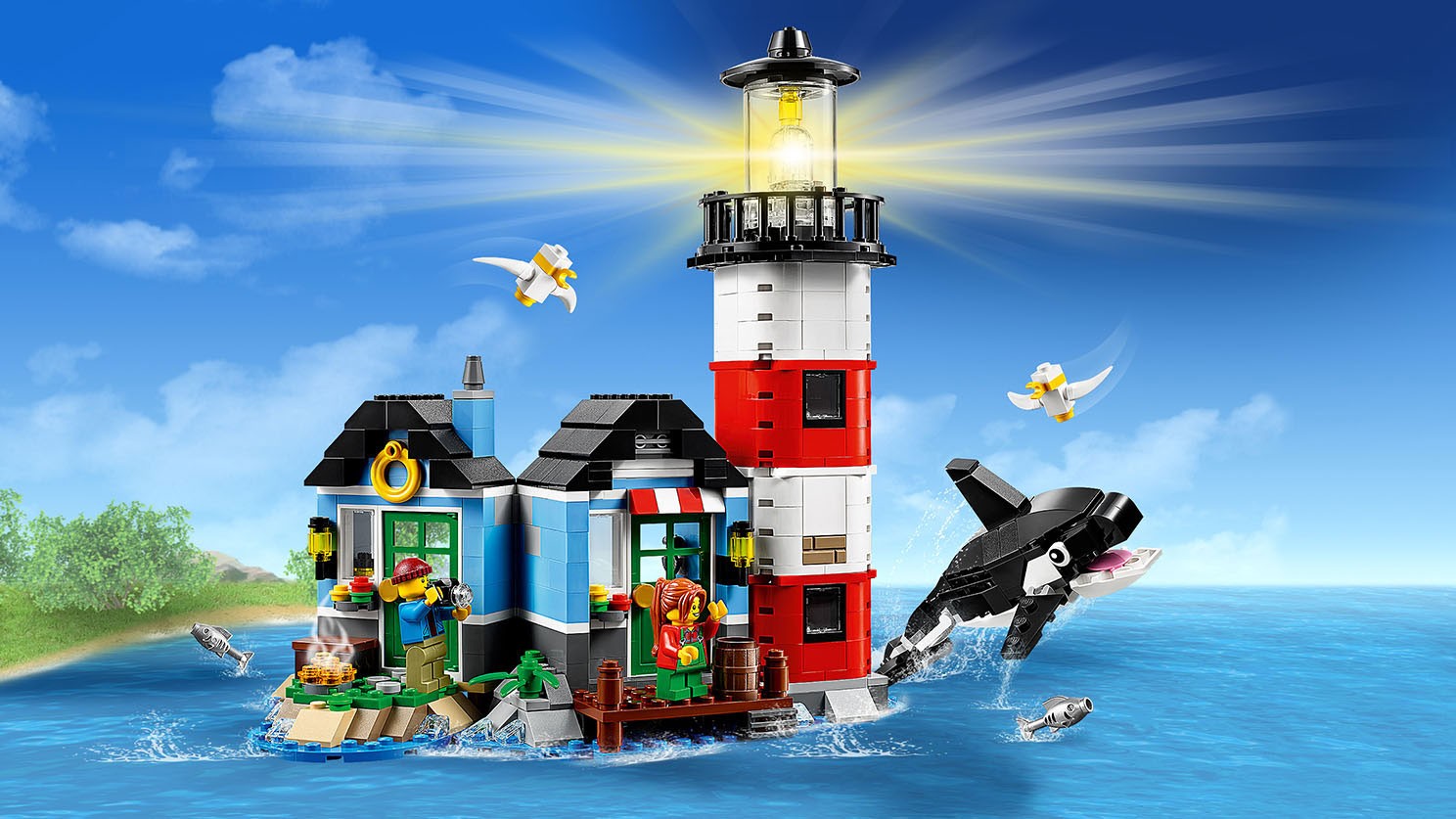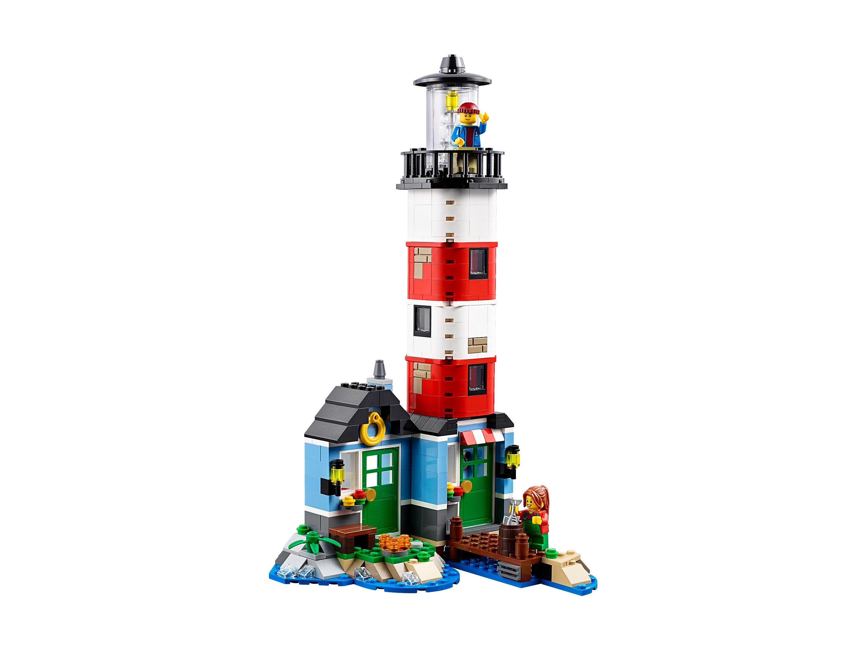 Ten uroczy model potrafi dostarczyć mnóstwa zabawy, Znajdziesz w nim latarnię morską i domek latarnika ze szczegółowo ukazanym wnętrzem, które obejmuje stół, krzesło, lampę i obraz. Do latarni dołączony jest świecący klocek LEGO®. W zestawie są też fale rozbijające się o brzeg, ławka, ognisko, skały i pomost. Ten zestaw LEGO Creator typu „3 w 1” zawiera system umożliwiający tworzenie rozbudowanych scenariuszy zabawy. Zastosowanie modułów pozwala łatwo przerobić latarnię morską na dom z pomostem i motorówką lub łódź mieszkalną. Zawiera 2 minifigurki, a do tego orkę i 2 mewy.