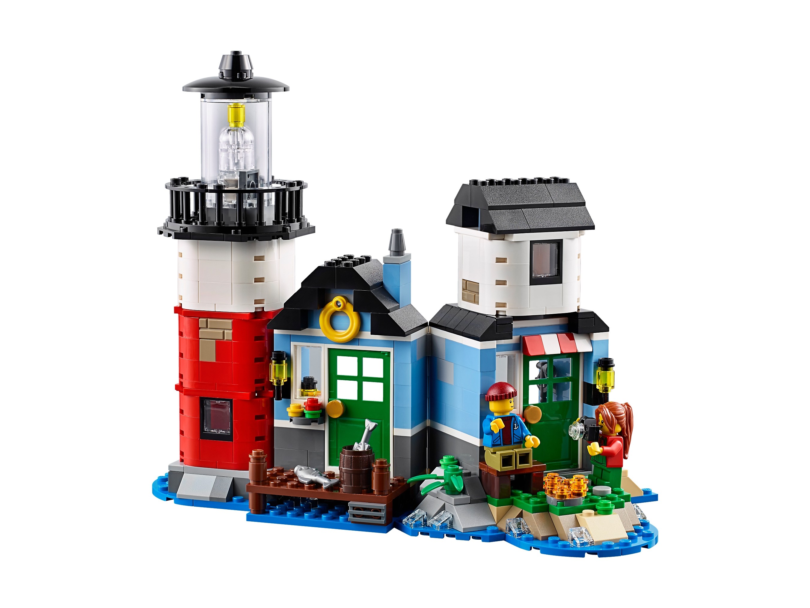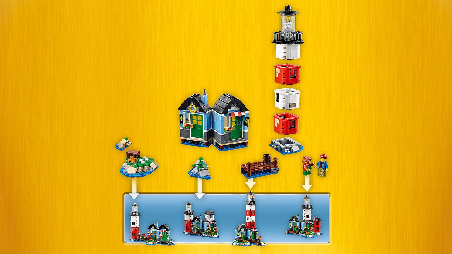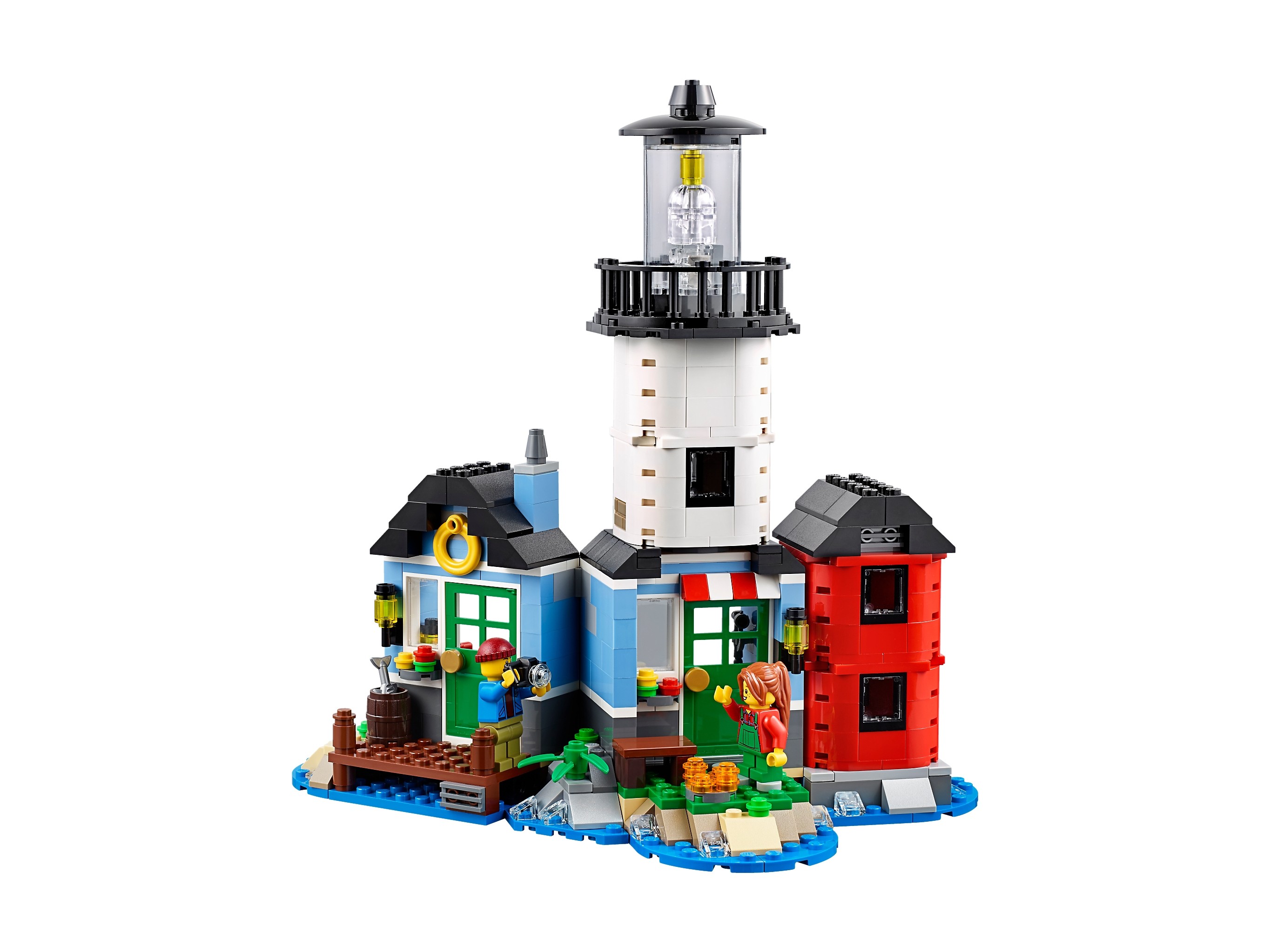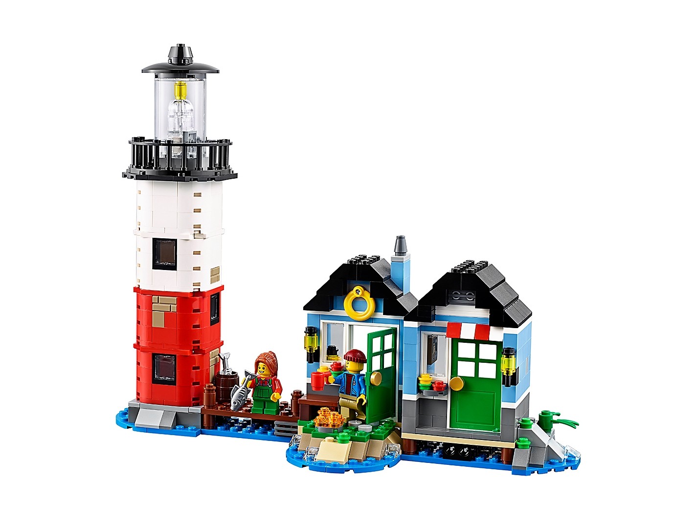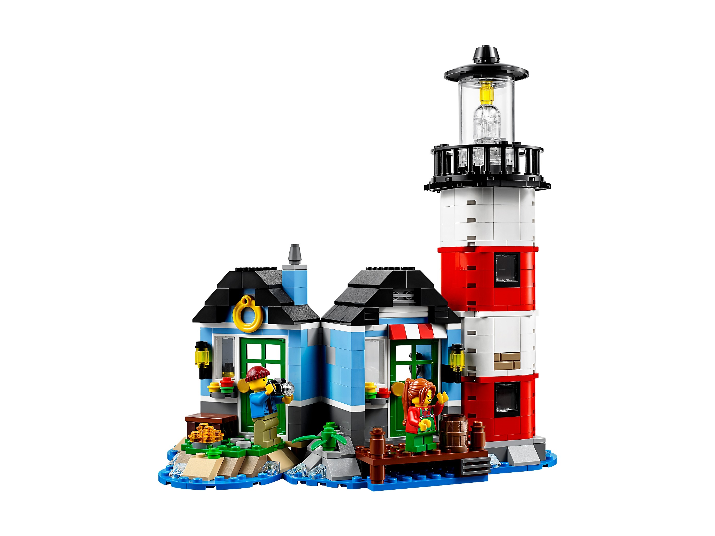 Ten uroczy model potrafi dostarczyć mnóstwa zabawy, Znajdziesz w nim latarnię morską i domek latarnika ze szczegółowo ukazanym wnętrzem, które obejmuje stół, krzesło, lampę i obraz. Do latarni dołączony jest świecący klocek LEGO®. W zestawie są też fale rozbijające się o brzeg, ławka, ognisko, skały i pomost. Ten zestaw LEGO Creator typu „3 w 1” zawiera system umożliwiający tworzenie rozbudowanych scenariuszy zabawy. Zastosowanie modułów pozwala łatwo przerobić latarnię morską na dom z pomostem i motorówką lub łódź mieszkalną. Zawiera 2 minifigurki, a do tego orkę i 2 mewy.