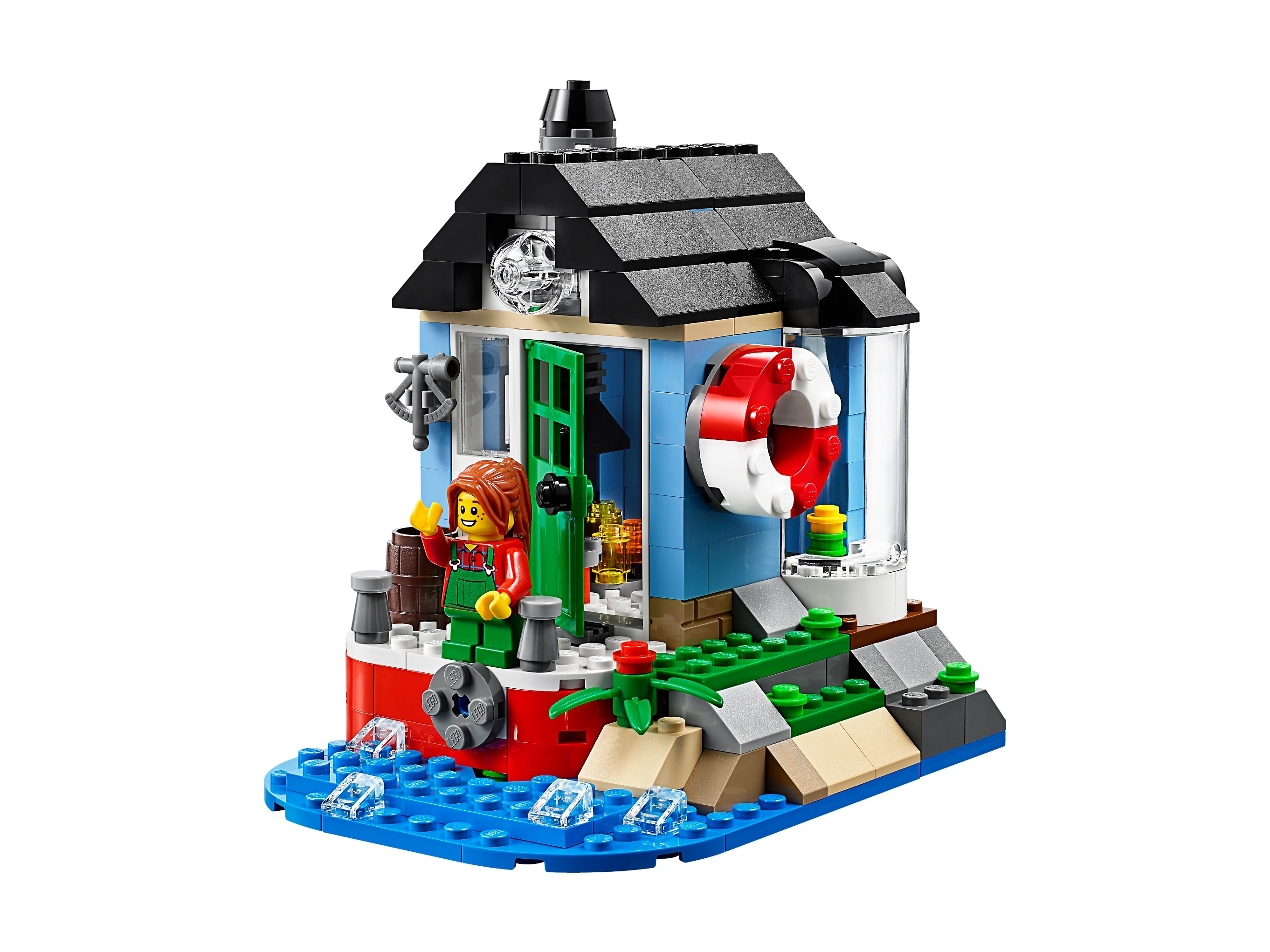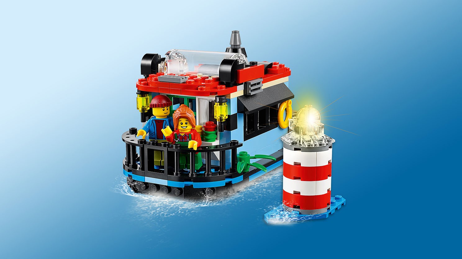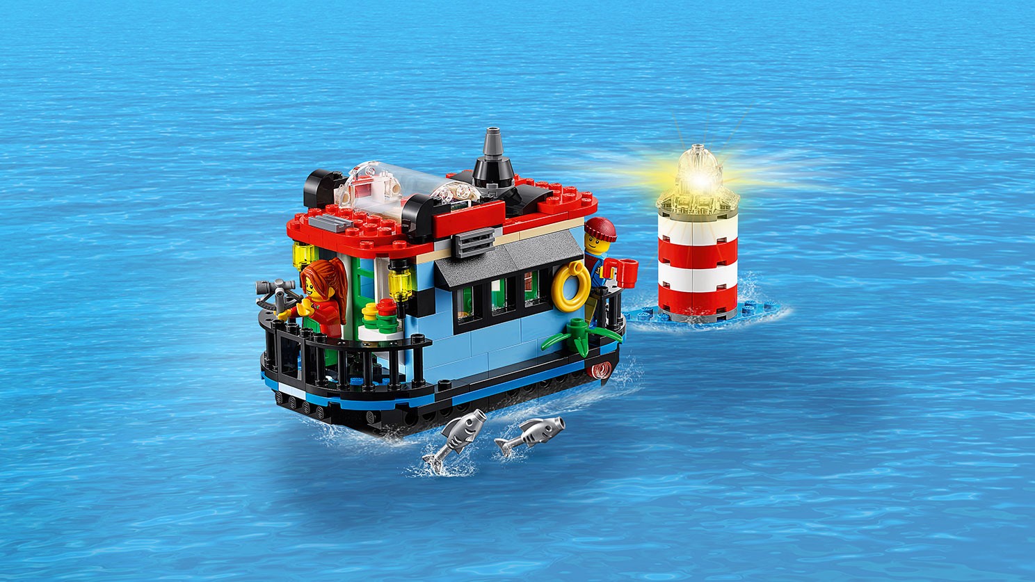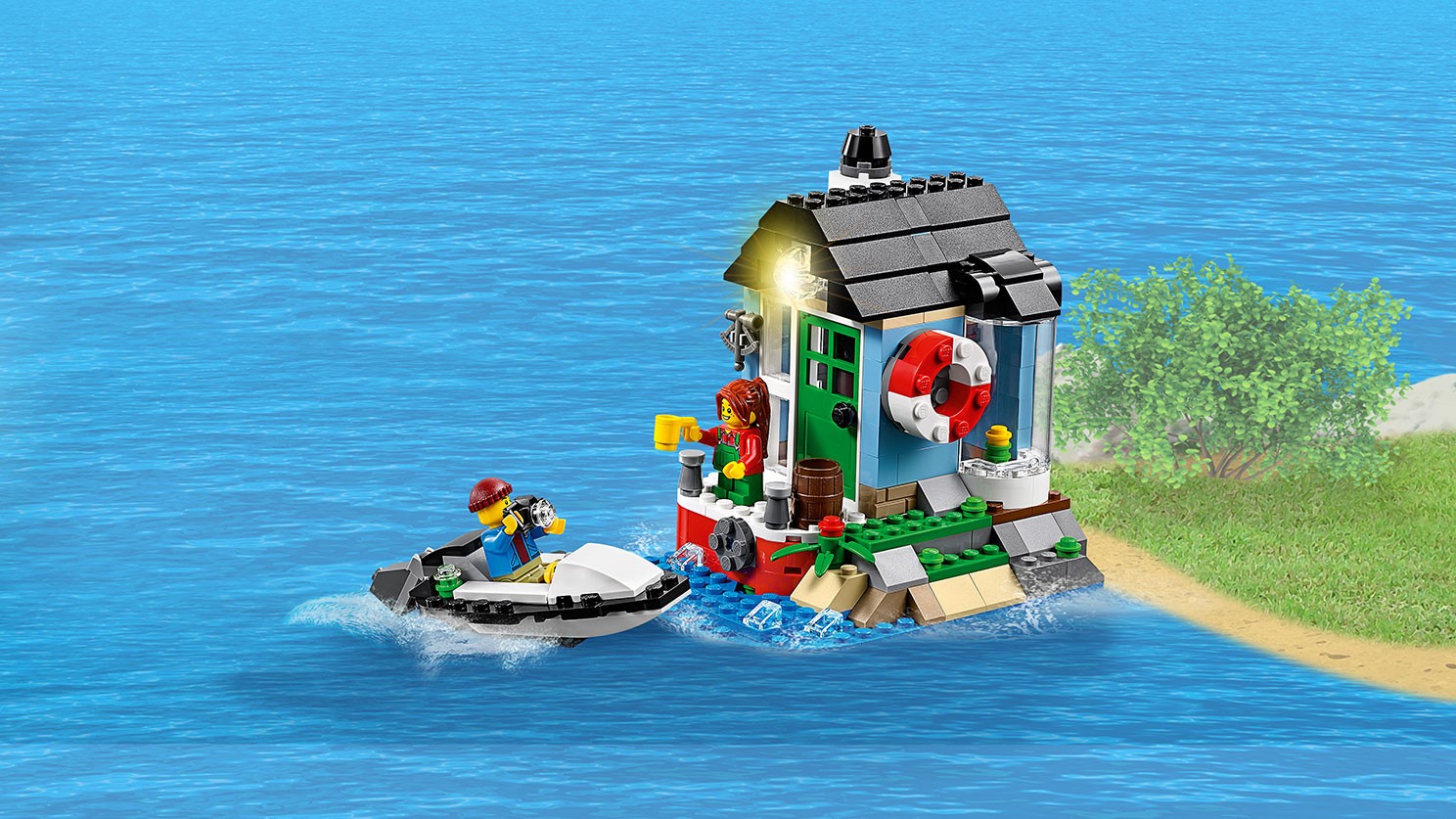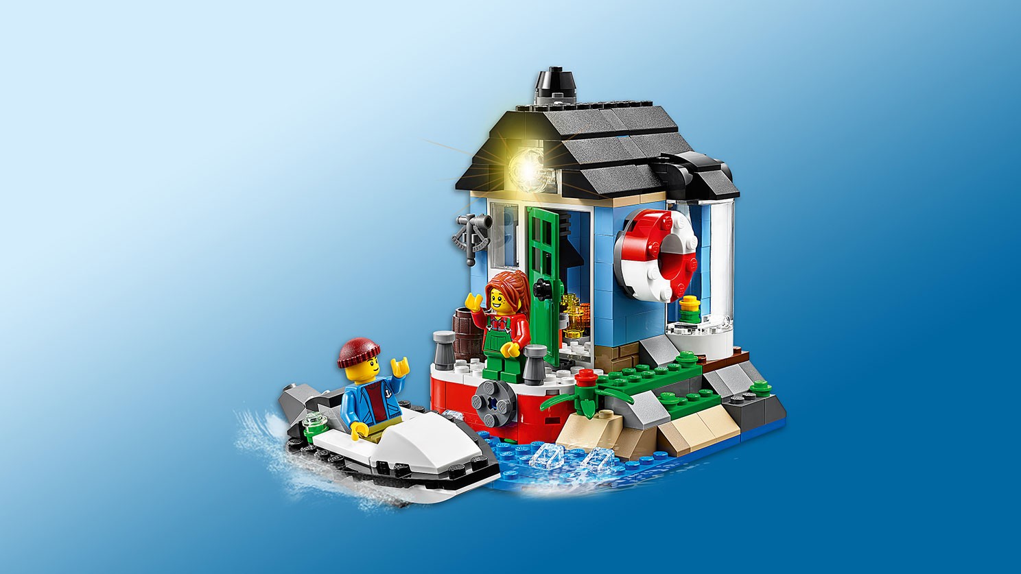 Ten niezwykły zestaw LEGO® Creator typu „3 w 1” pozwoli Ci przeżyć mnóstwo przygód nad brzegiem morza. Znajdziesz w nim przytulną latarnię morską i domek latarnika ze szczegółowo ukazanym wnętrzem, które obejmuje stół, krzesło, lampę i obraz. Wdrap się na galeryjkę, skąd roztacza się wspaniały widok na okolicę. Nie zapomnij włączyć światła, żeby przepływające statki wiedziały, dokąd się kierować. Później możesz już rozgościć się w domku latarnika i wypić coś pysznego. Z okna widać przepływającąprzyjacielską orkę. Gdy zapadnie zmierzch, możesz rozpalić ognisko i słuchać szumu fal. Gdy znudzi Ci się latarnia, wystarczy że przestawisz sekcje modelu i zmienisz ją w dom z pomostem i motorówką lub w łódź mieszkalną.