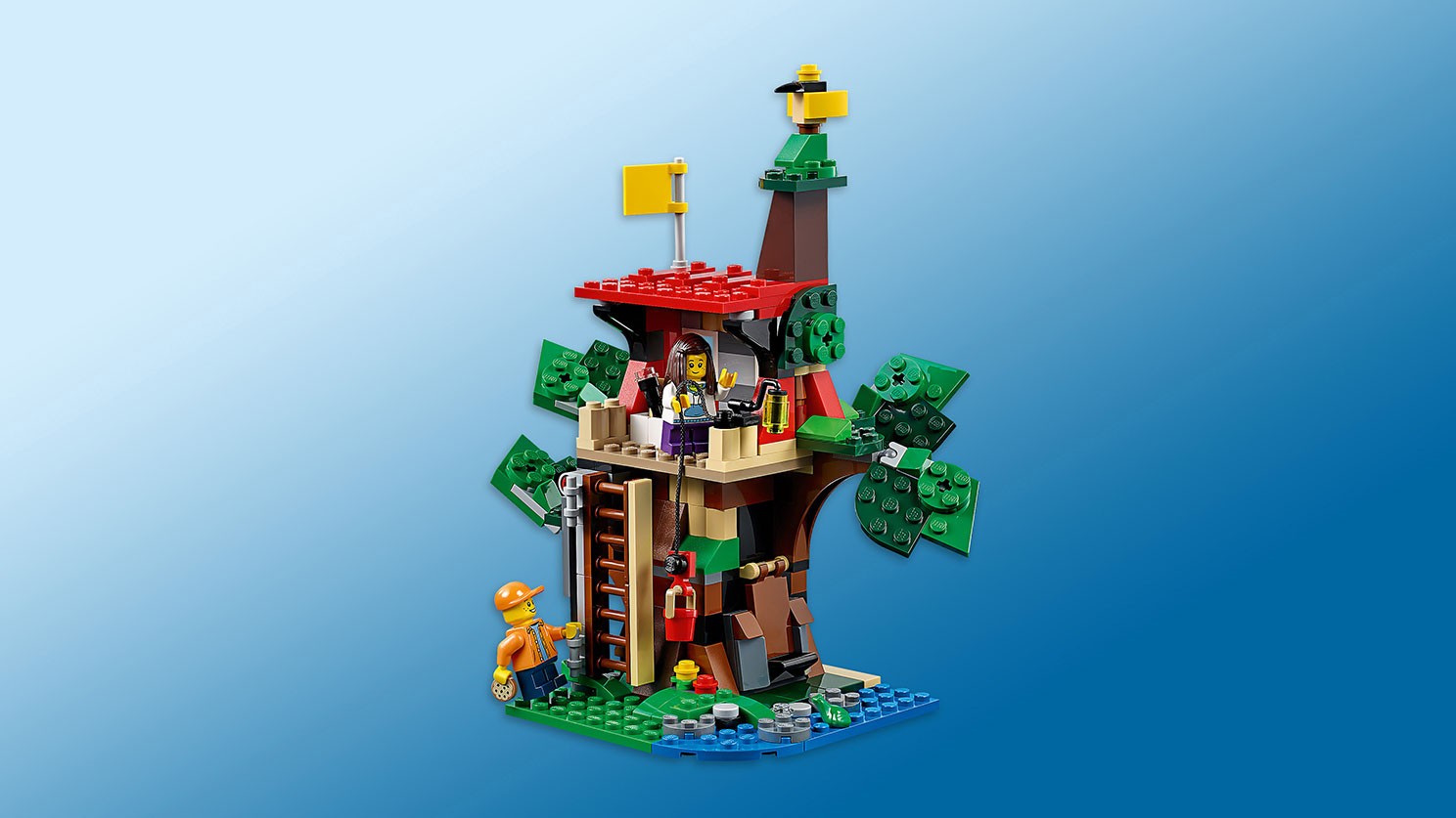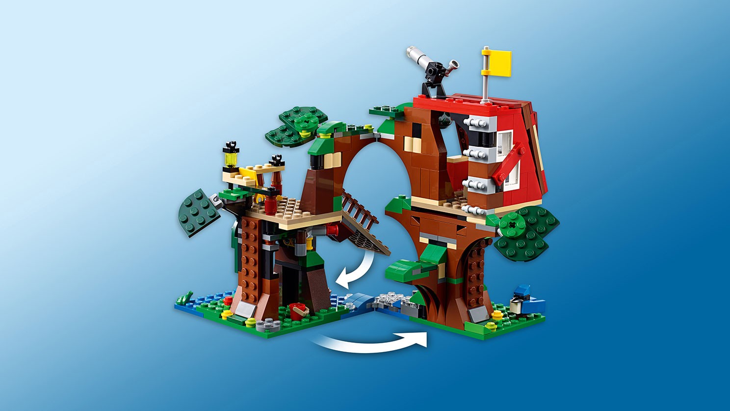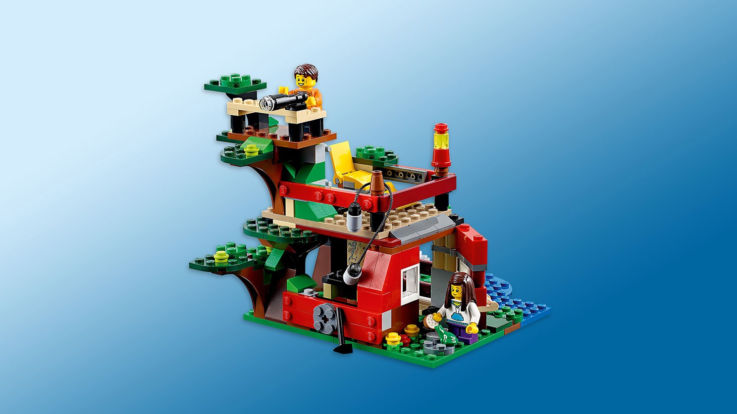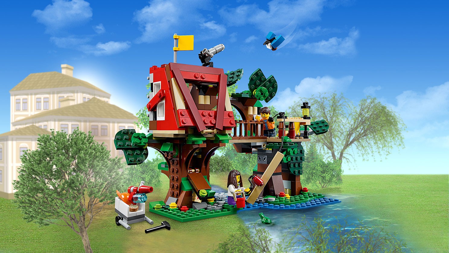 Niezwykły domek na drzewie zachwyca bogactwem funkcji — pomóż go zbudować! Model można rozłożyć, tworząc podwójny domek połączony ogrodzoną kładką. Po złożeniu powstanie dom na drzewie ze szczegółowo ukazanym wnętrzem. Wygląd drzewa można zmieniać dzięki poruszającym się liściom. Ma ono też sekretną skrytkę, która mieści się w pniu. W zestawie znajdziesz drabinę, wyciągarkę, teleskop, flagę, 2 lampy i bogaty wybór akcesoriów, które rozbudzą Twoją wyobraźnię i pomogą wymyślać scenariusze zabawy. Ten model LEGO® Creator typu „3 w 1” można przerobić na klub lub fort na drzewie. Zawiera 2 minifigurki, sójkę i żabę.